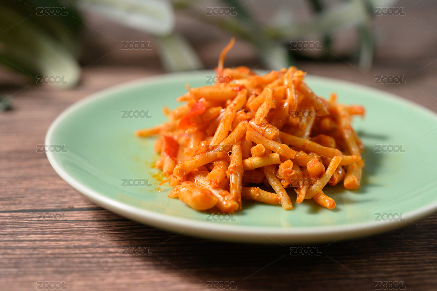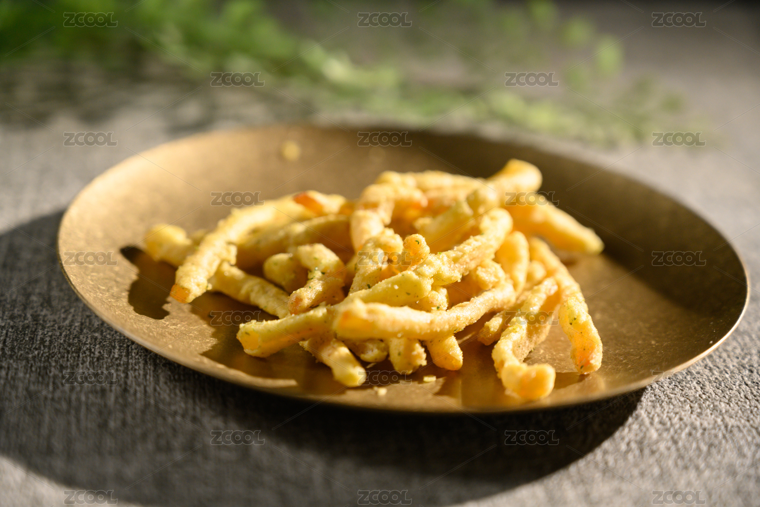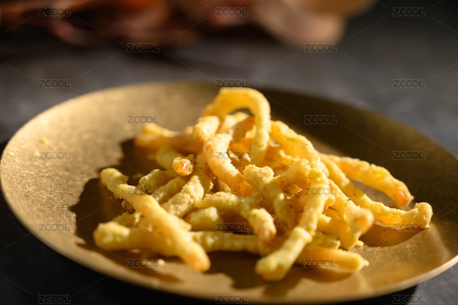 桌面上的盘子里的美味可口的油炸鱿鱼丝