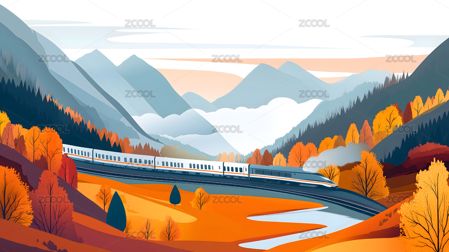 秋天里飞驰的列车插画