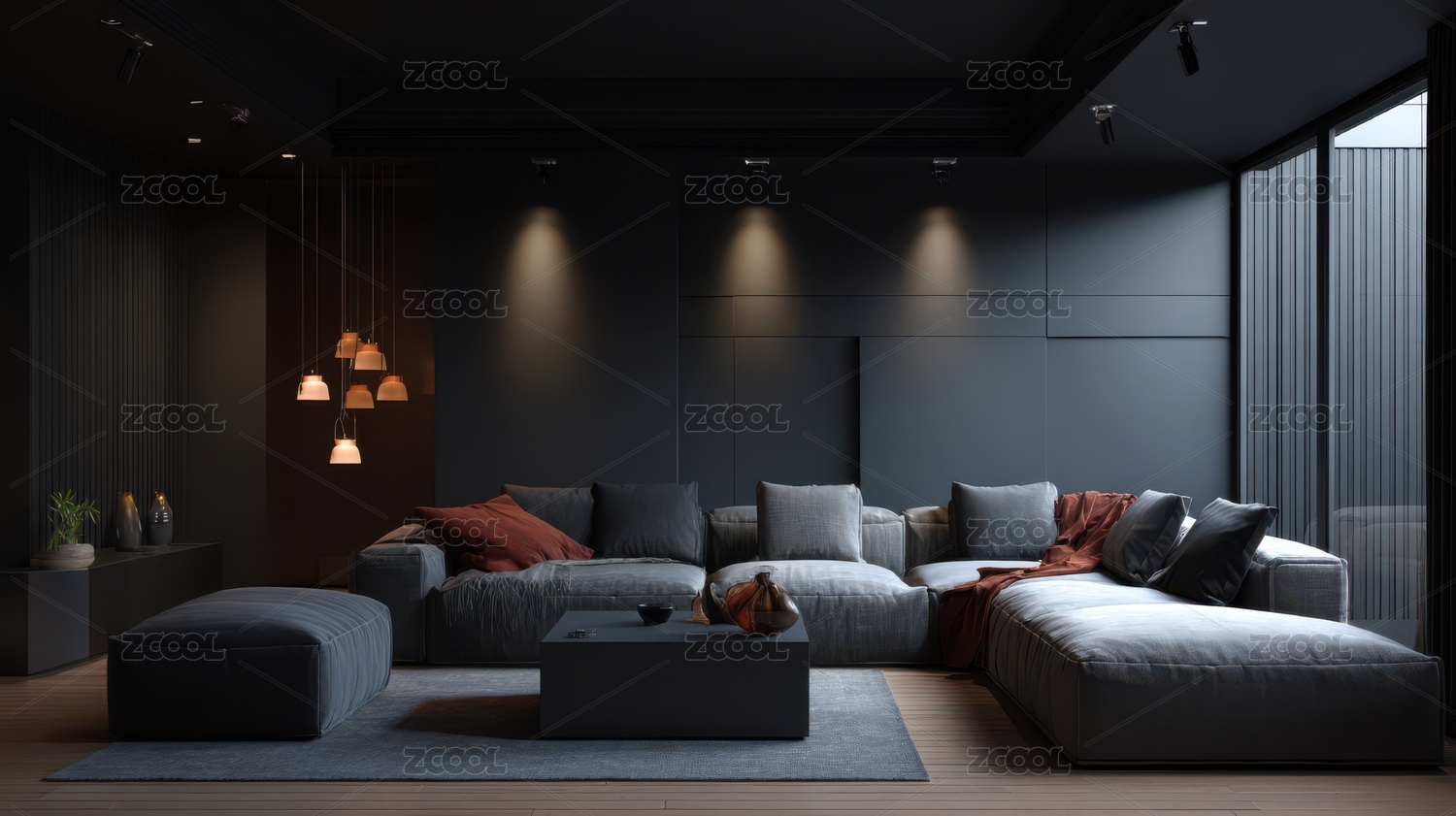 暗调,家居,起居室,三维,场景,壁炉,火焰,沙发,玻璃窗,玻璃门