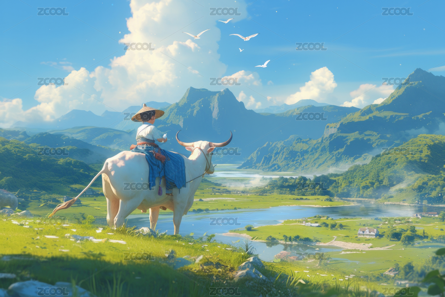 少年骑牛田园牧歌