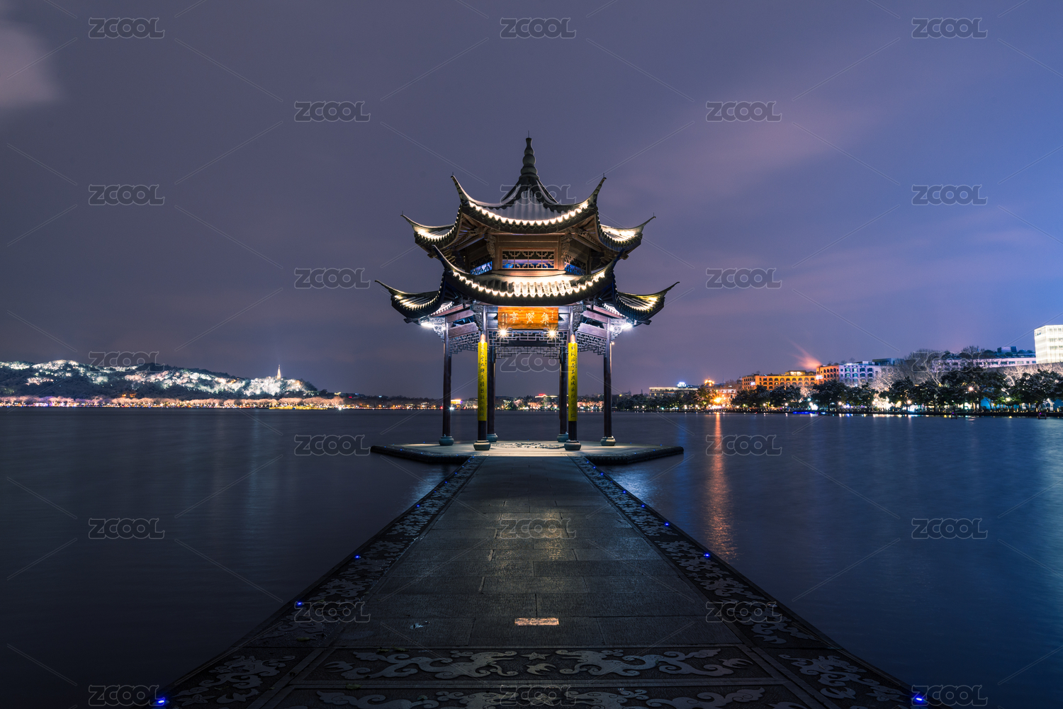 中国浙江杭州西湖标志性建筑集贤亭夜景