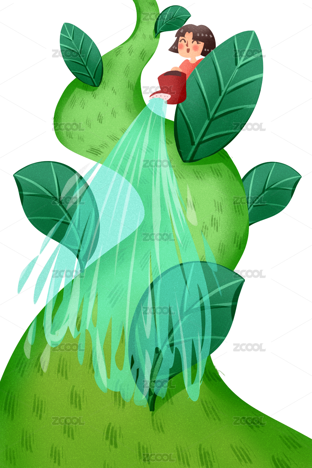 小清新风格,植树节,女孩,浇水,插画,种树,环境保护,爱护环境,绿色,奇幻