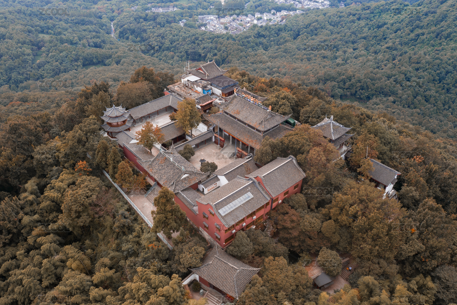 航拍秋季日出时的中国江苏南京栖霞山下栖霞寺