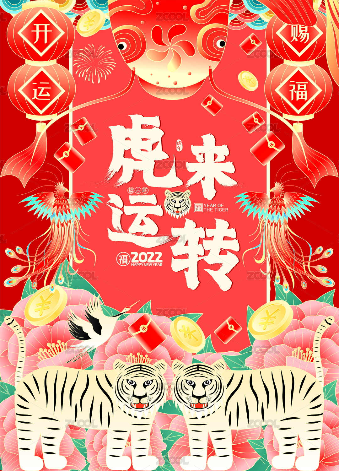 虎来运转国潮春节凤凰老虎呈祥锦鲤开运海报