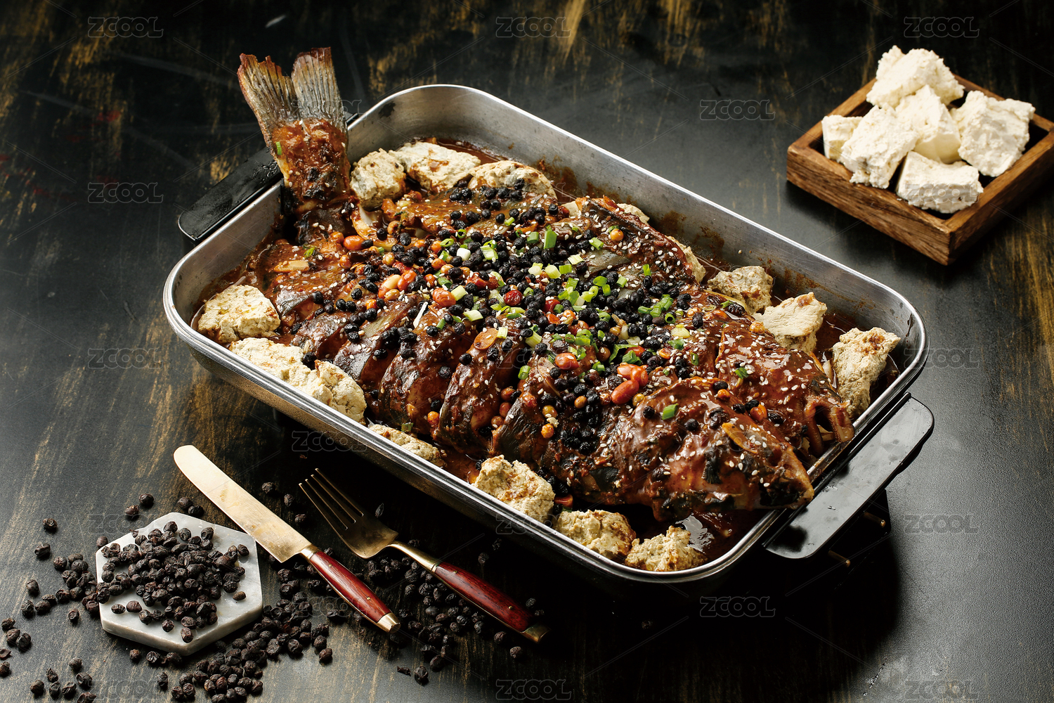 黑色桌面上有一盆酱香味烤鱼