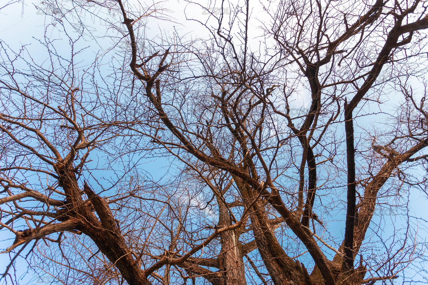 傍晚蓝天夕阳下巨大的银杏树干枝丫