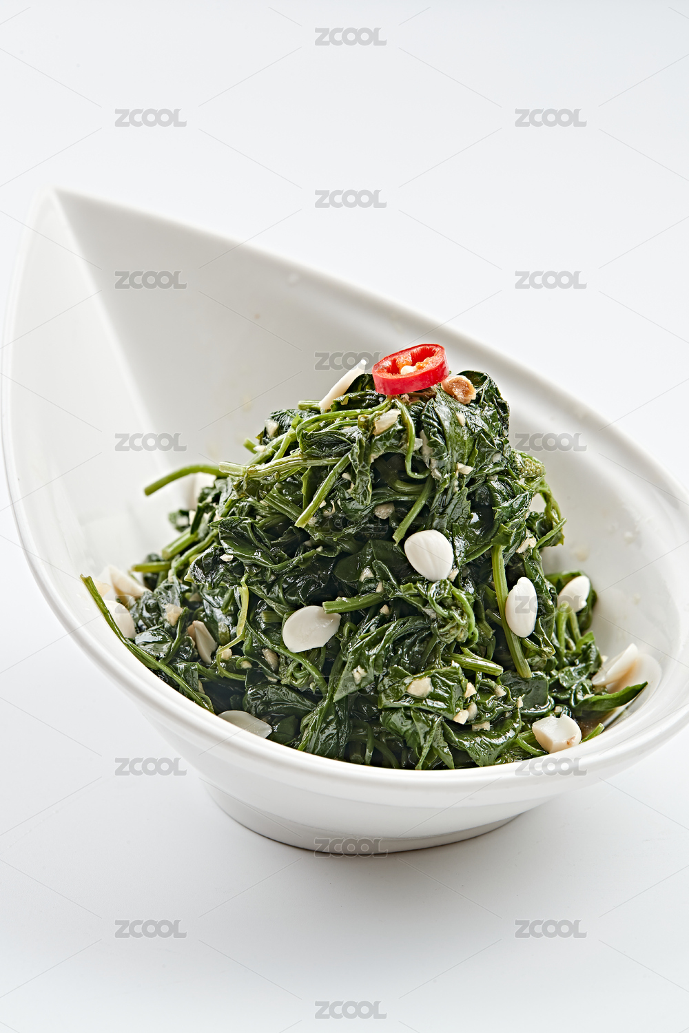 白色瓷盘装的杏仁炝拌野菜