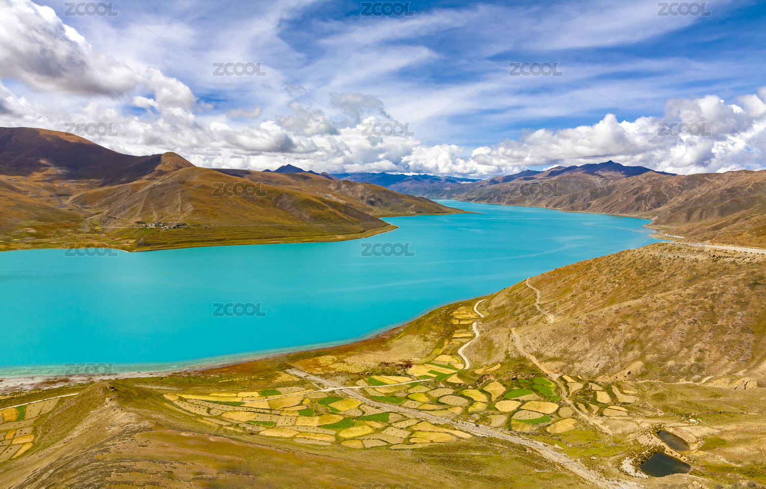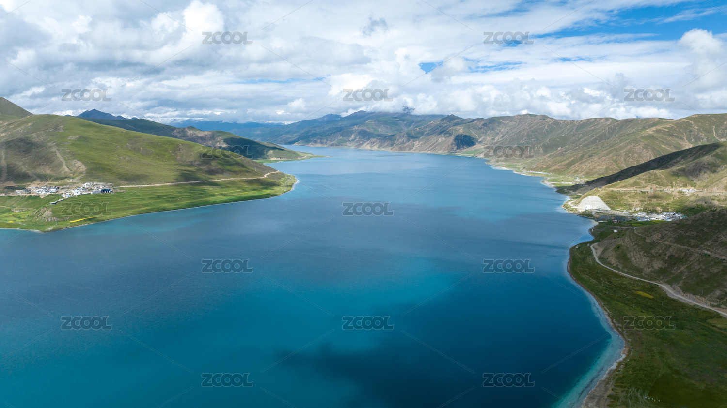 中国西藏羊卓雍措夏季绿色高山草原风景航拍