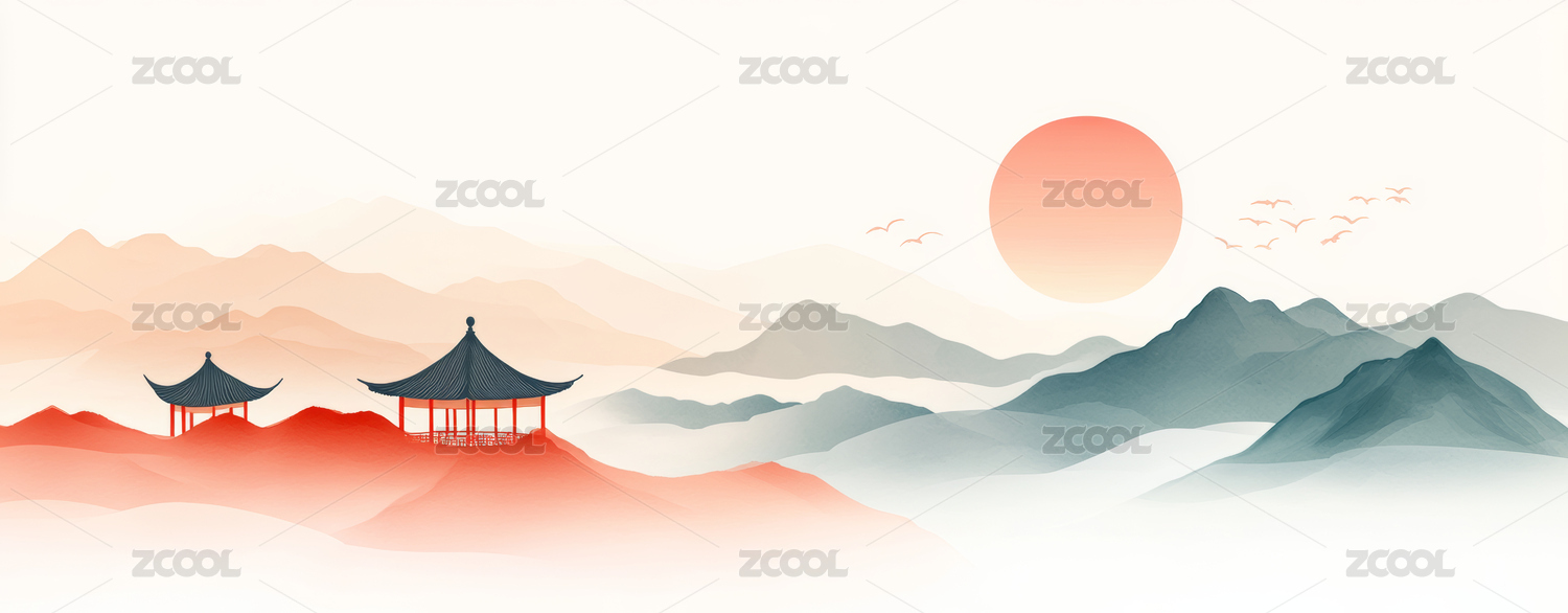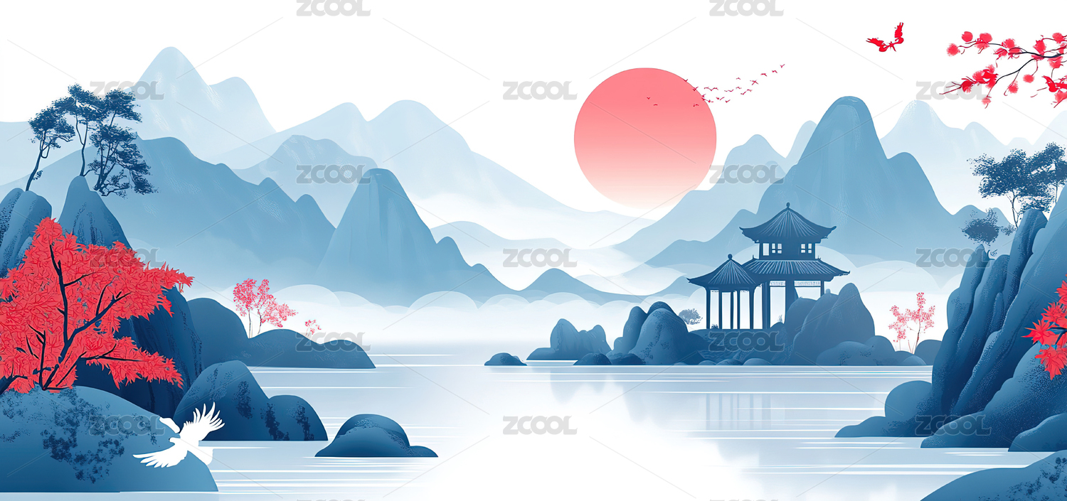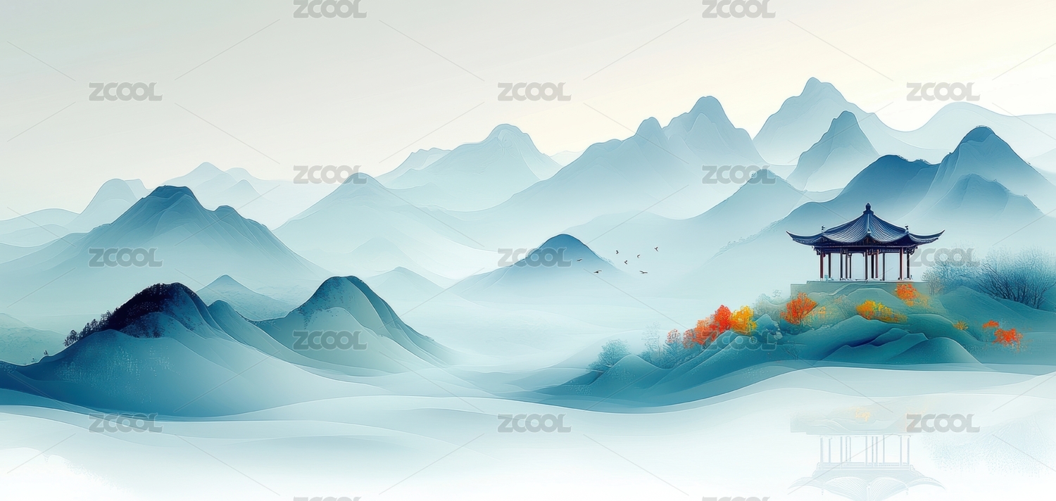 水墨画, 蓝色, 湖泊, 建筑, 山峰, 山水画, 江南, 船, 飞鸟, 云雾