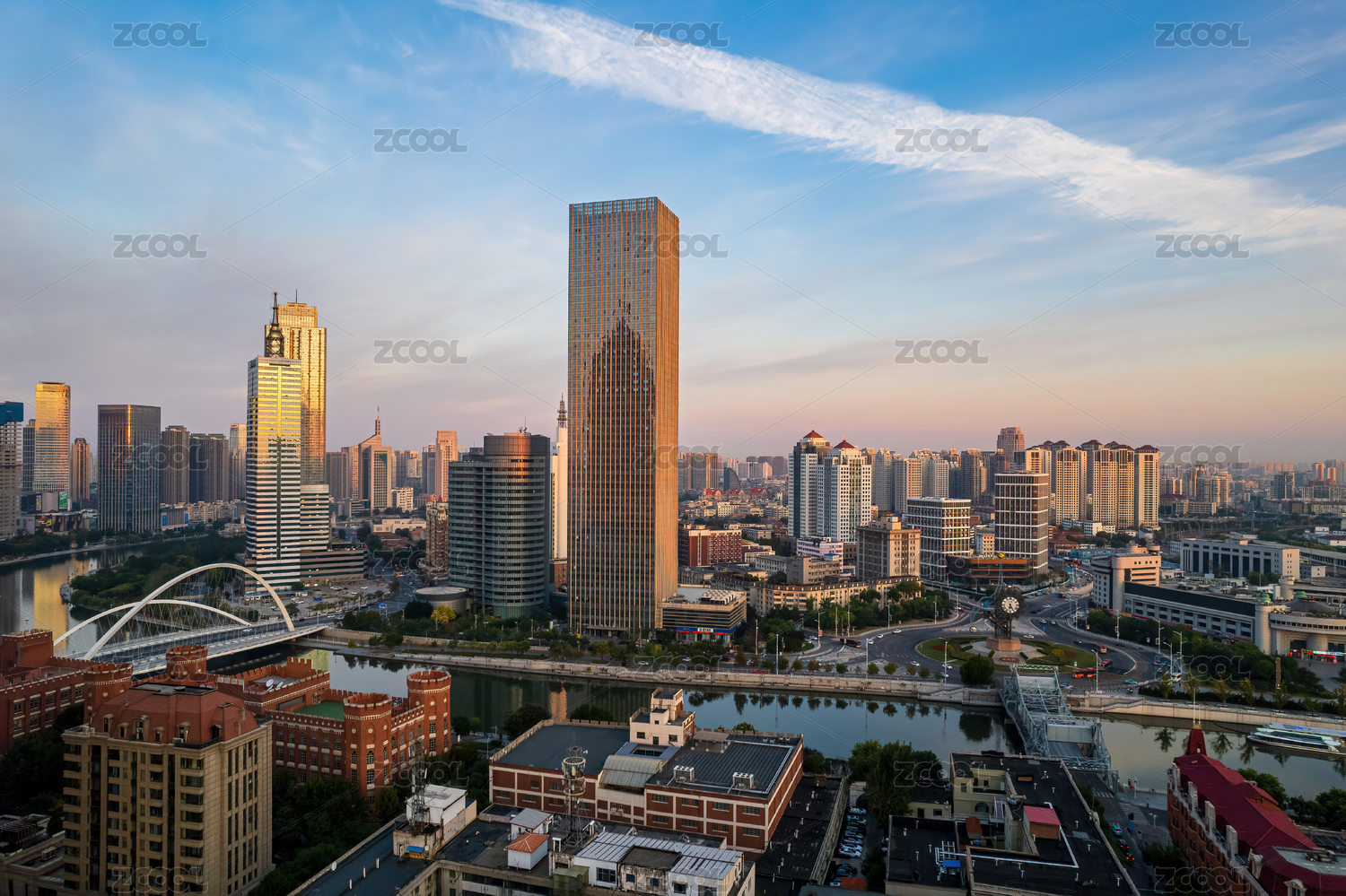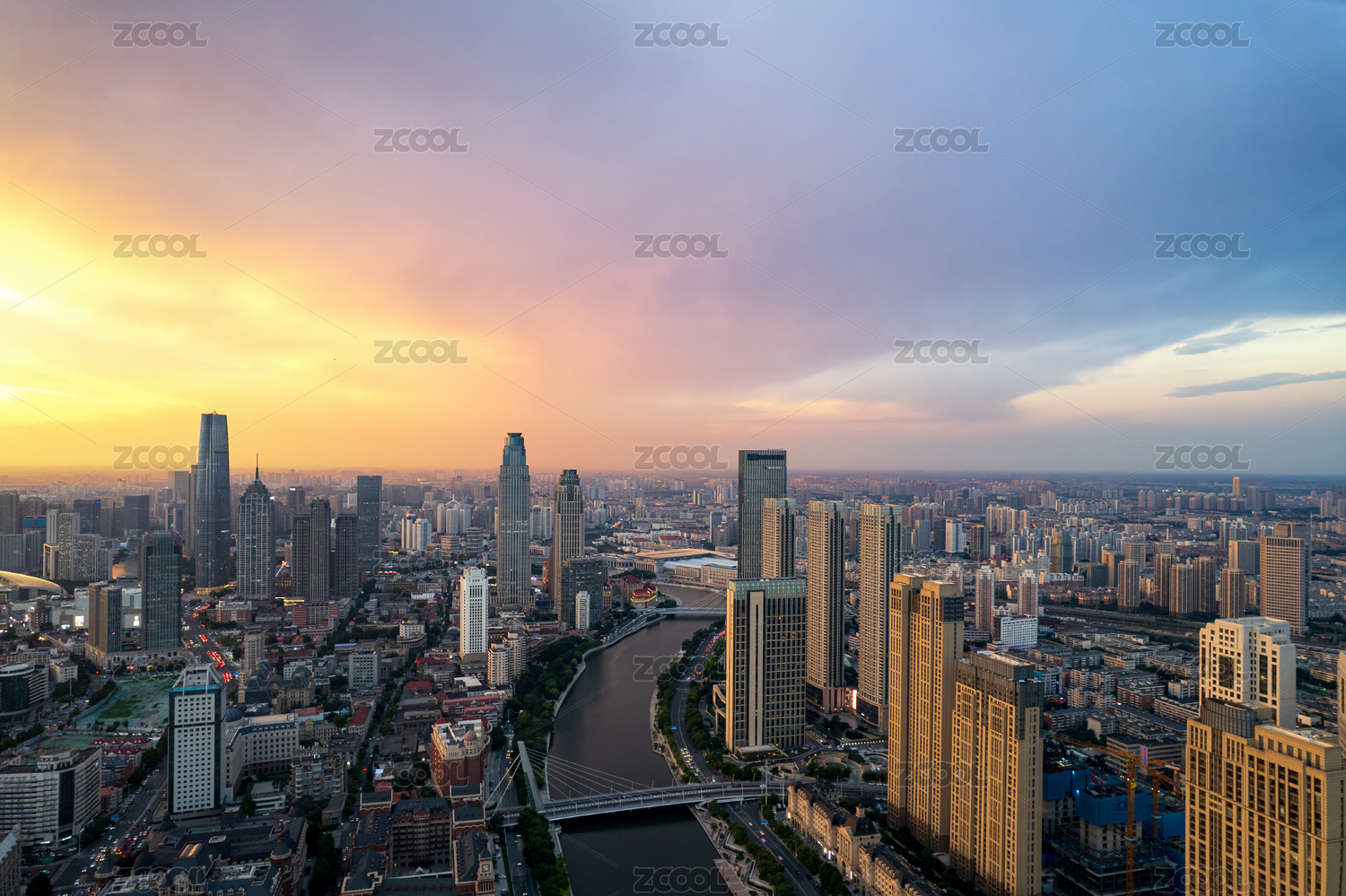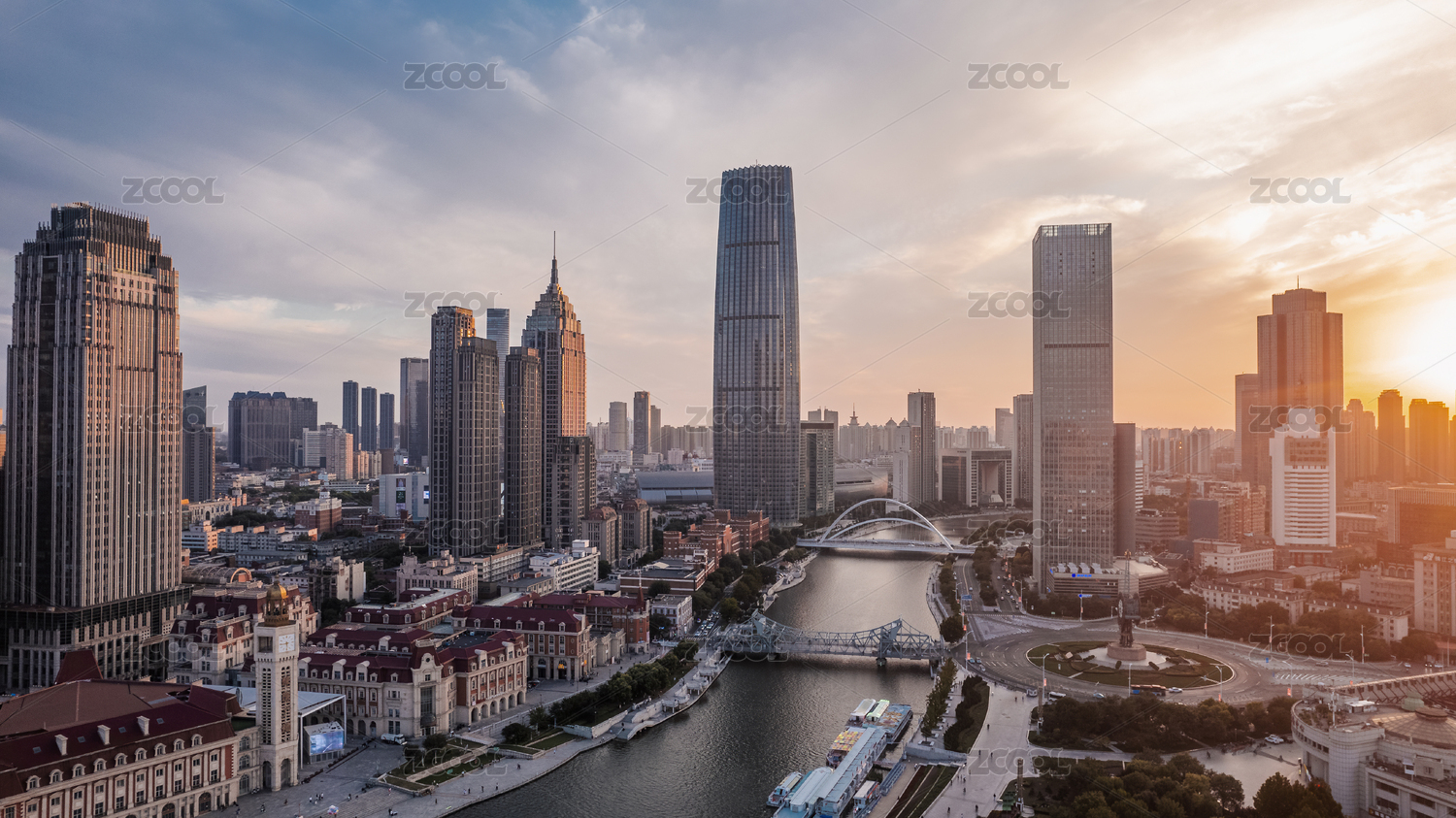 天津环球金融中心海河沿岸城市建筑日落晚霞