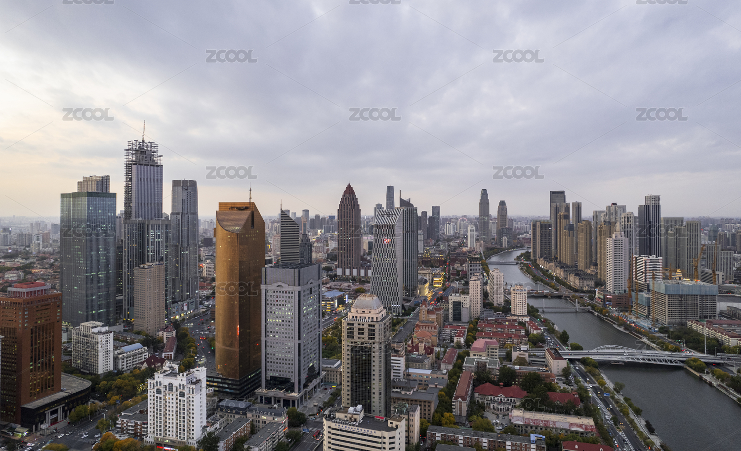 天津海河金汇桥小白楼商圈城市建筑日落风光