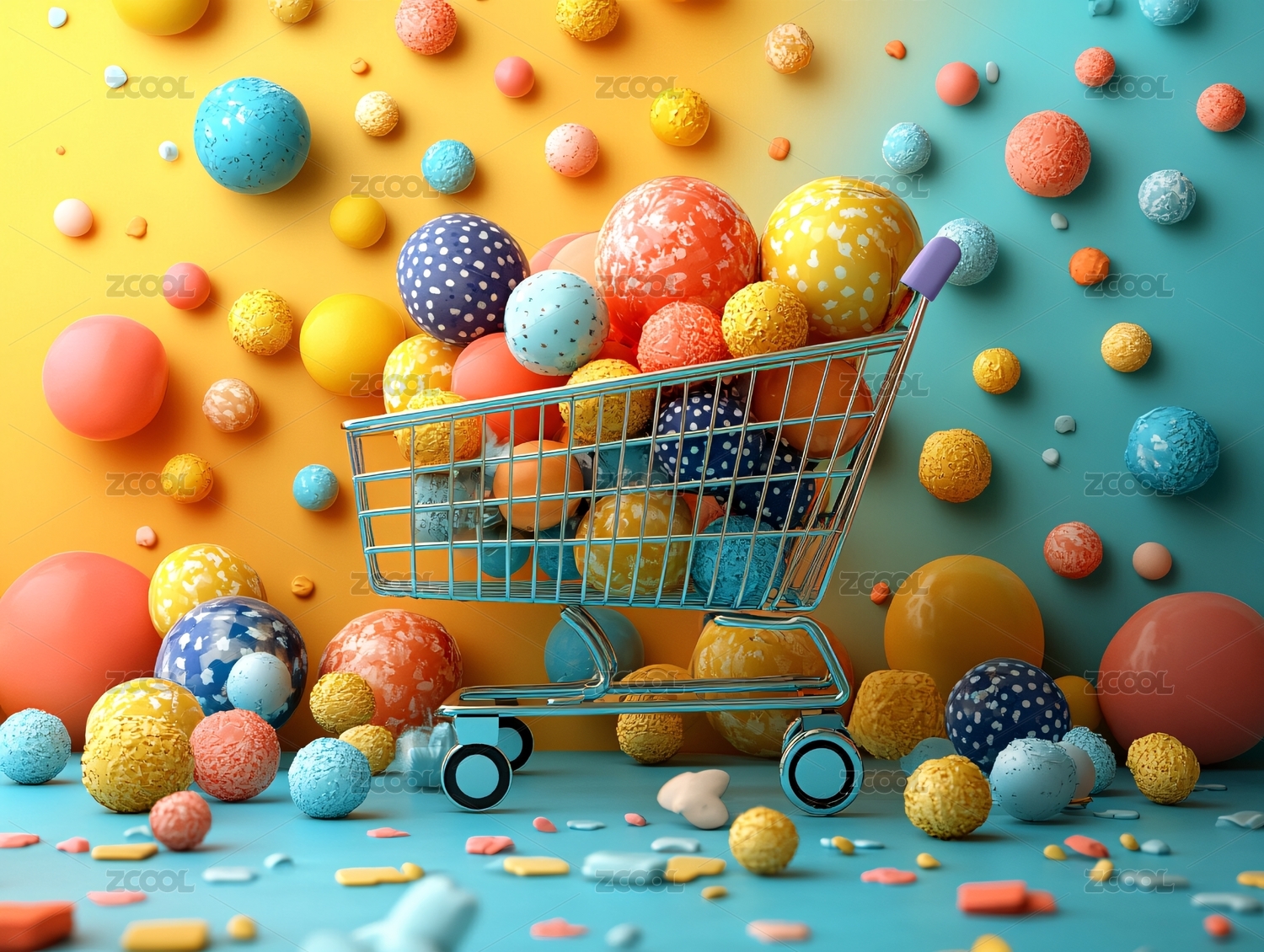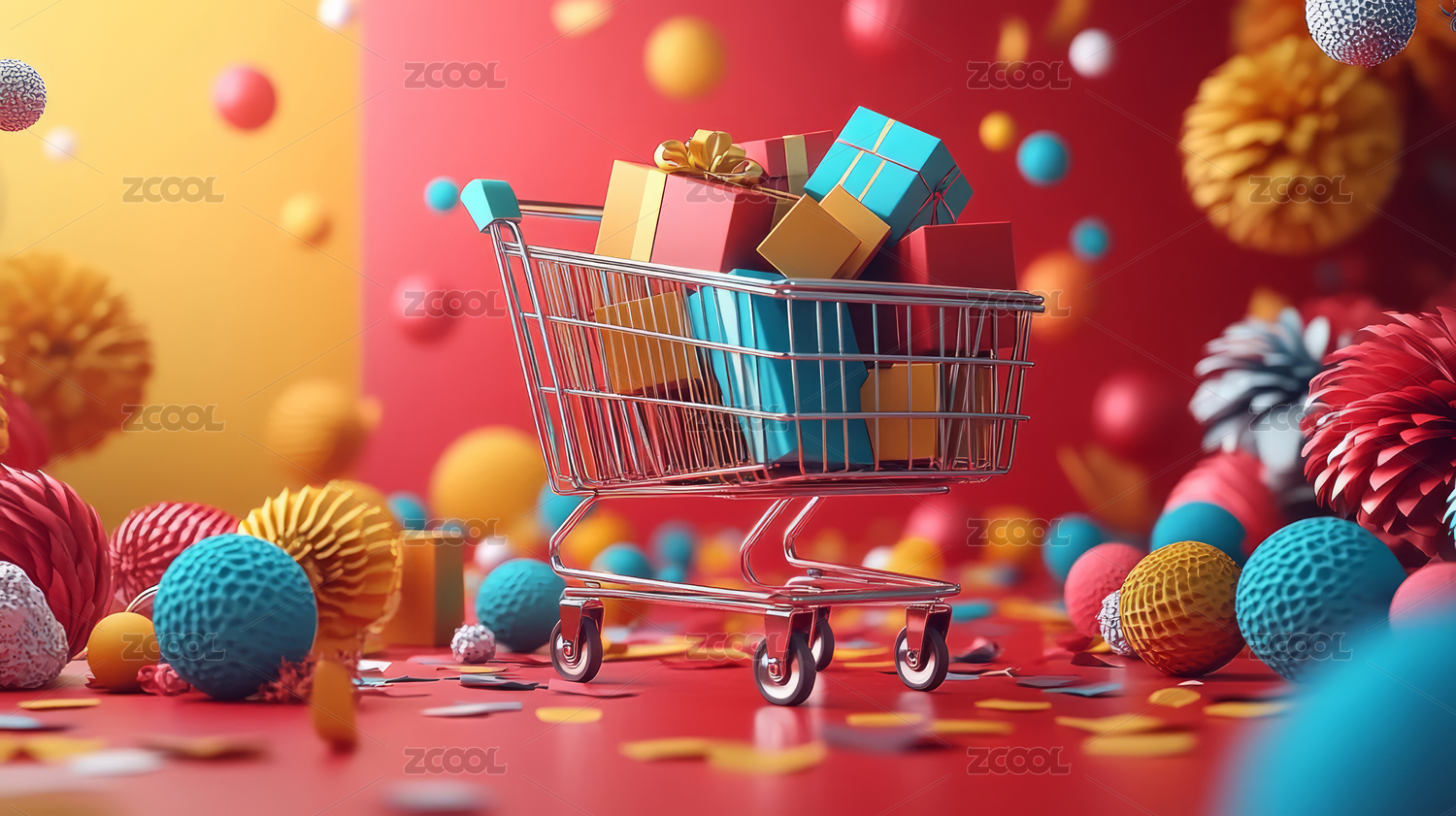 购物车与彩色形状抽象背景