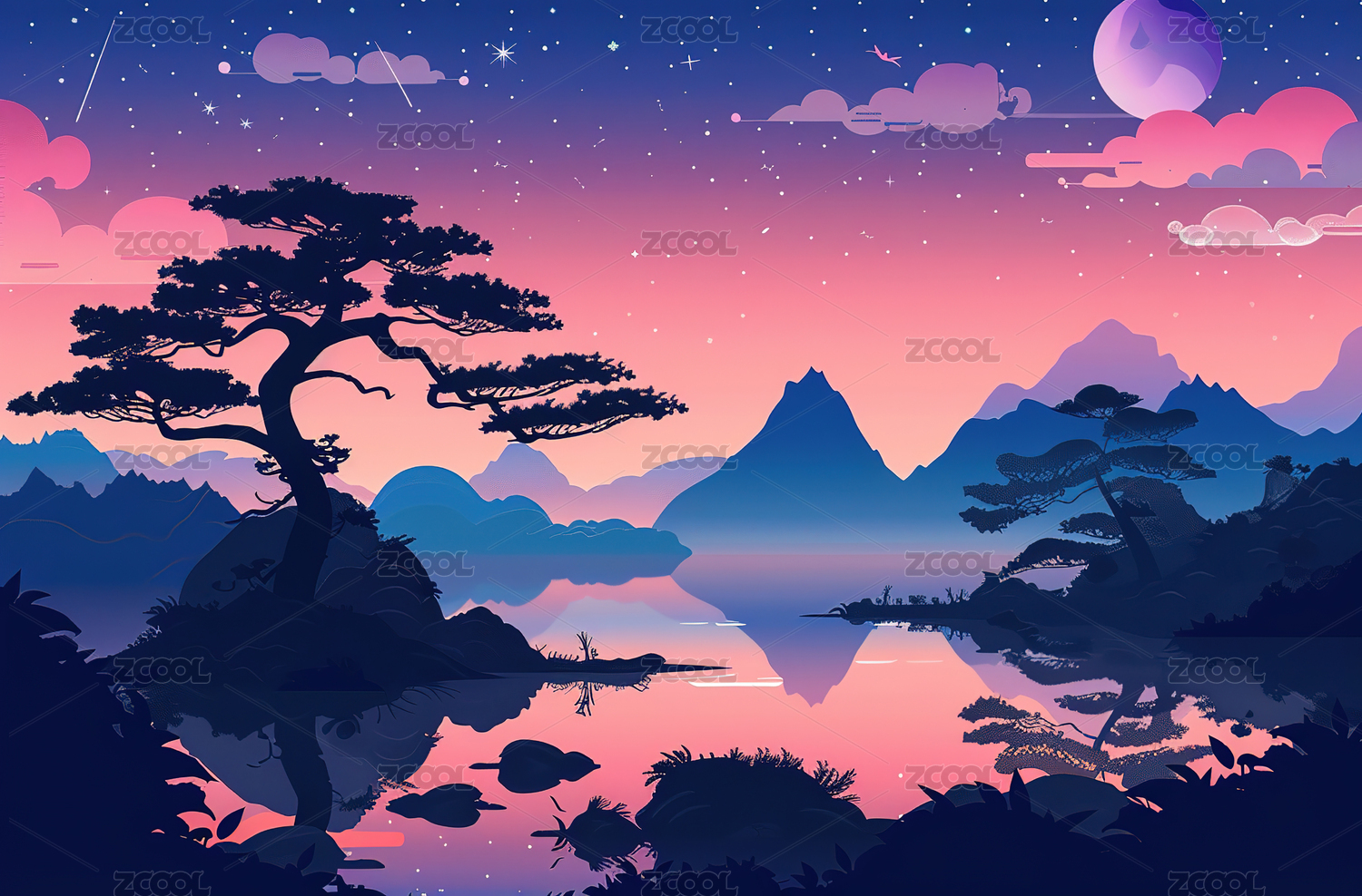 梦幻紫罗兰山湖日落
