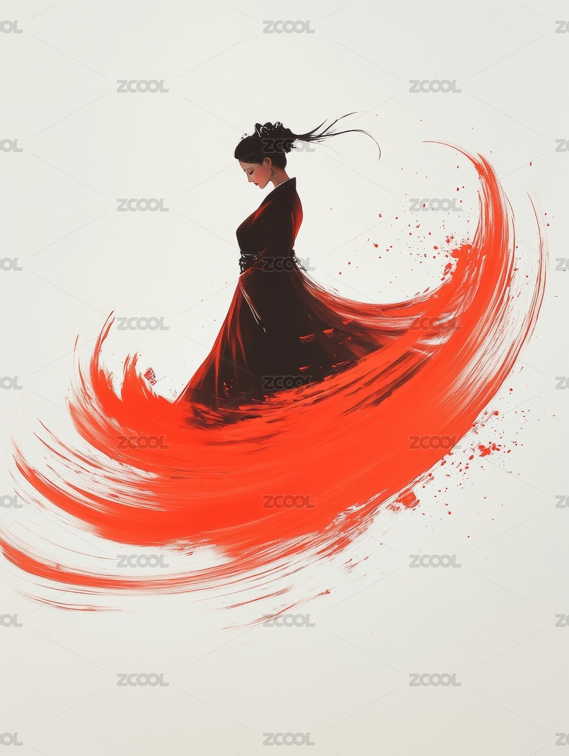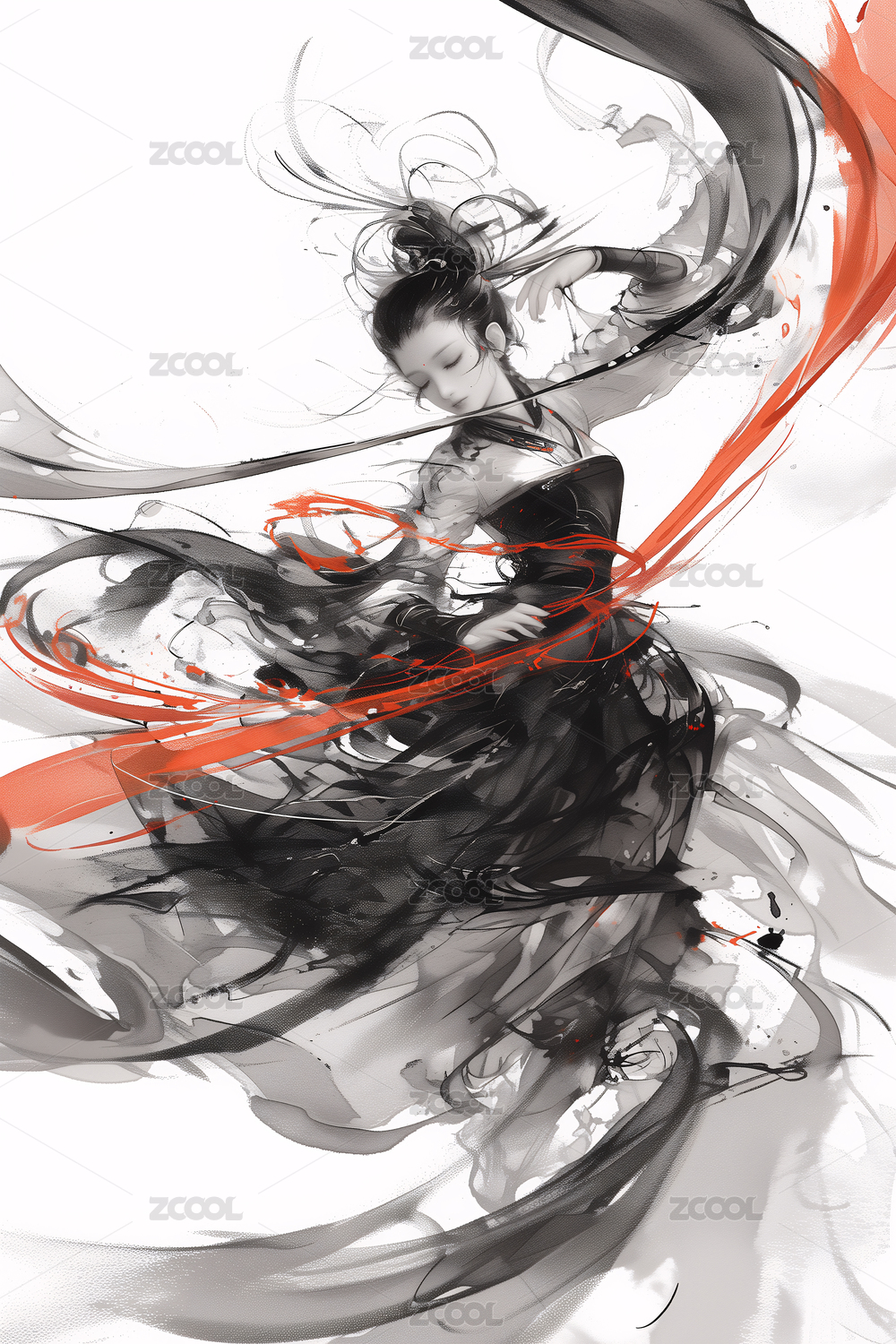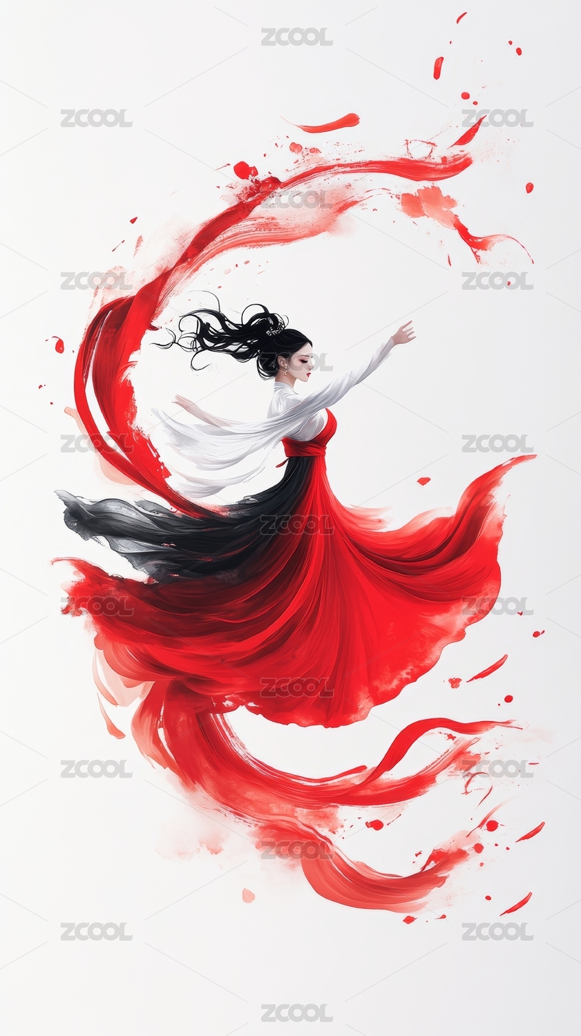 穿着汉服的女性在跳舞红色飘带唯美水墨插画