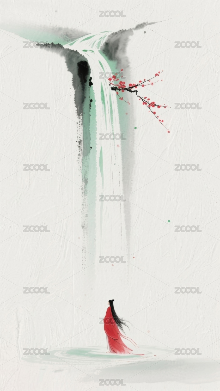 红衣人立于瀑布之下