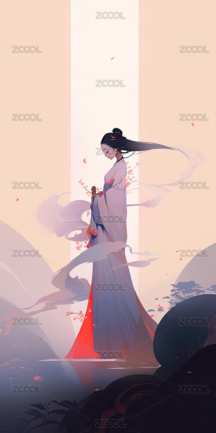 淡彩古风少女侧脸与极简禅意背景