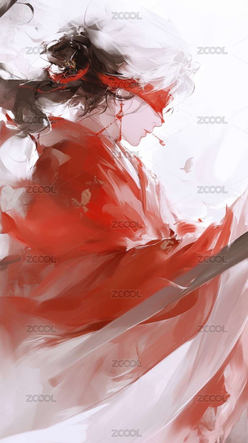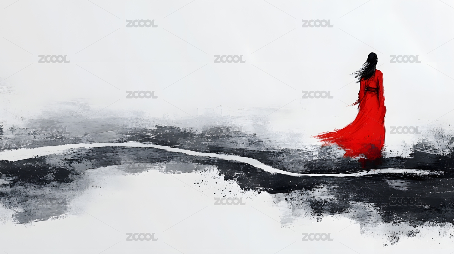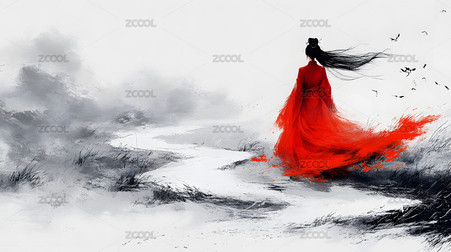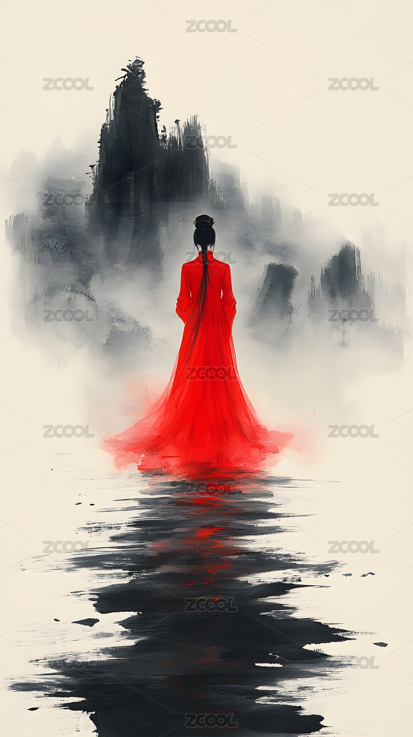 红衣女子江湖水墨插画