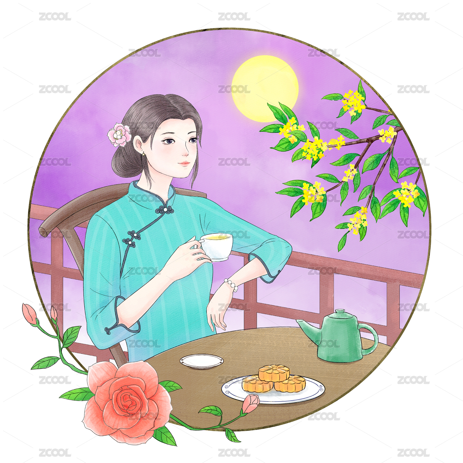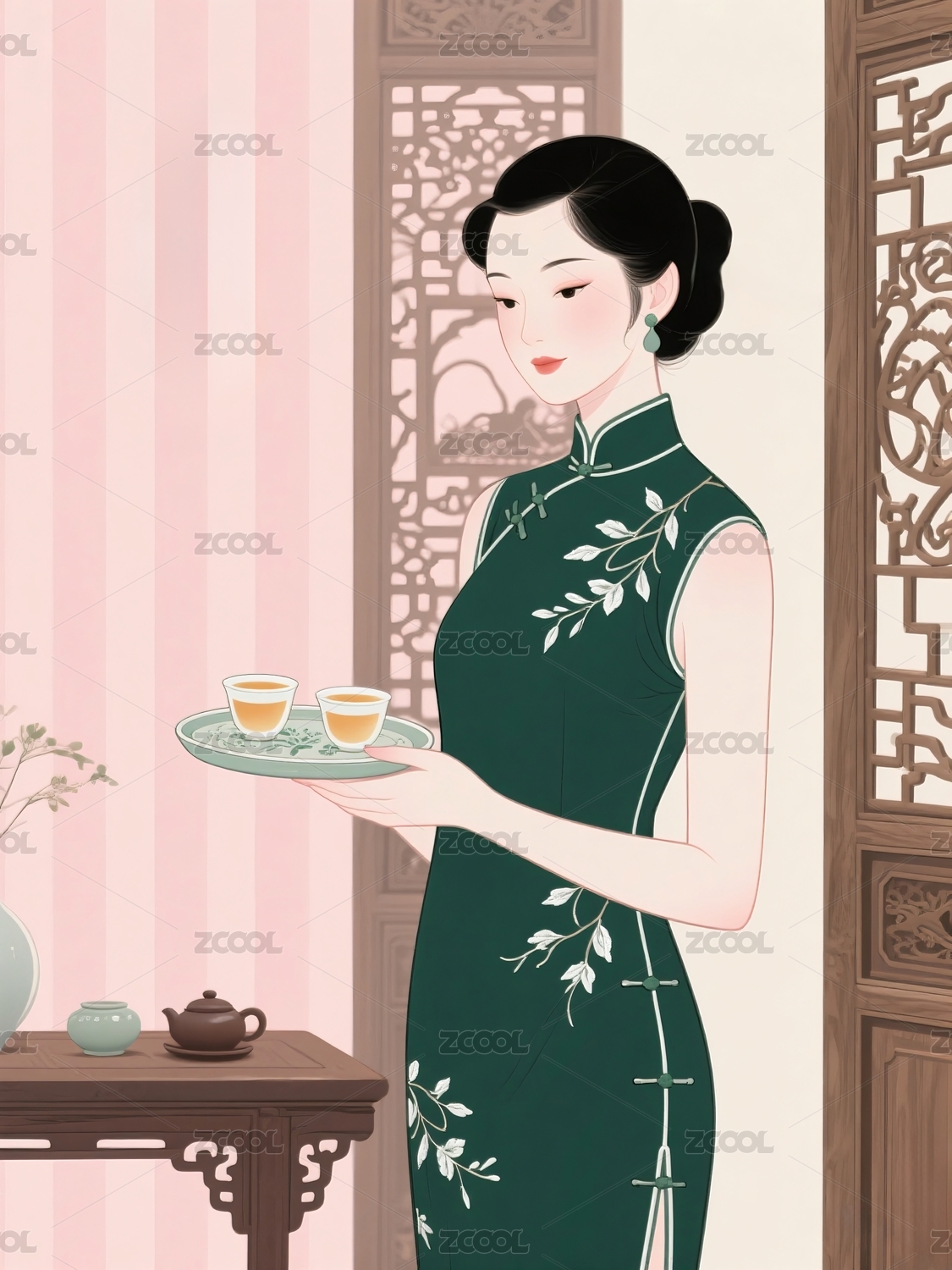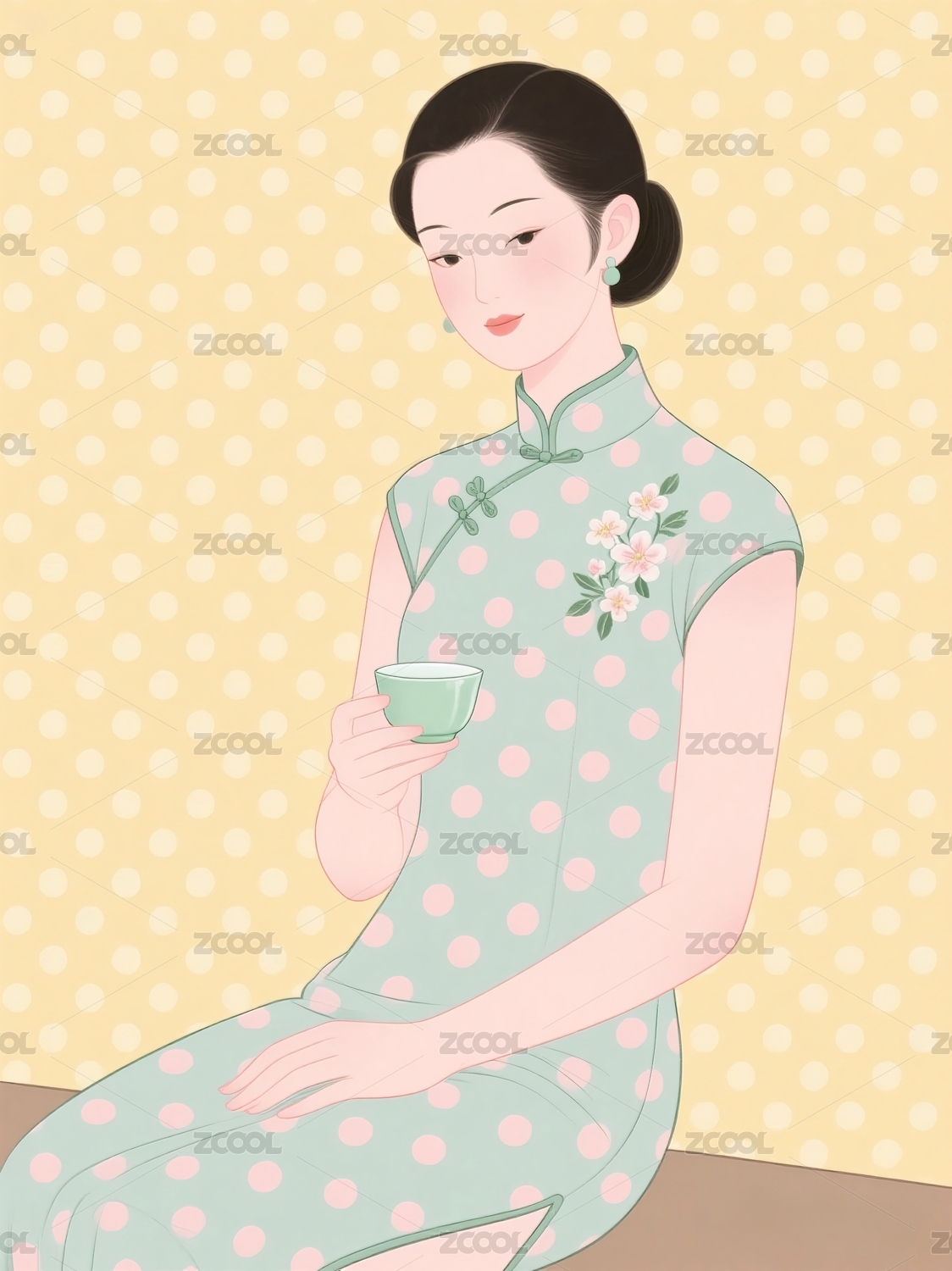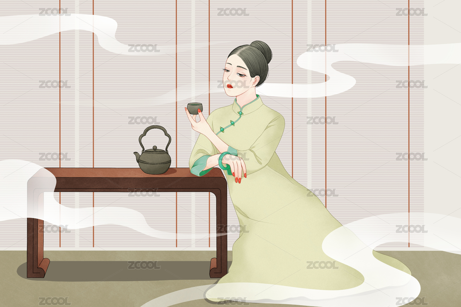 旗袍女性喝茶优雅人物国潮国风水墨插画