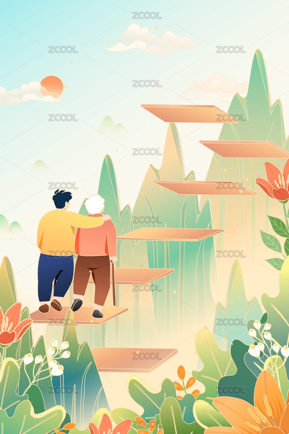 重阳节,海报,插画,孝敬老人,孝顺,父母,三人,儿子,爸爸,妈妈