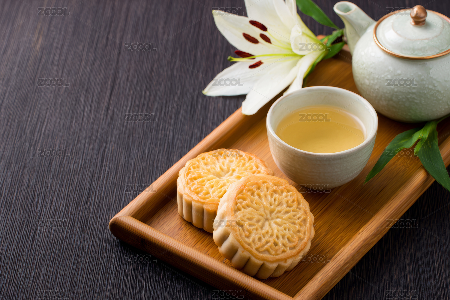 中秋佳节的甜点月饼和茶水及菊花和一个木勺