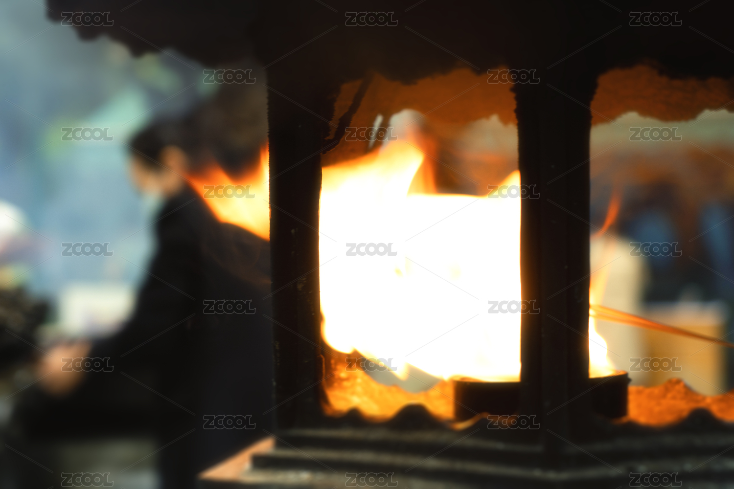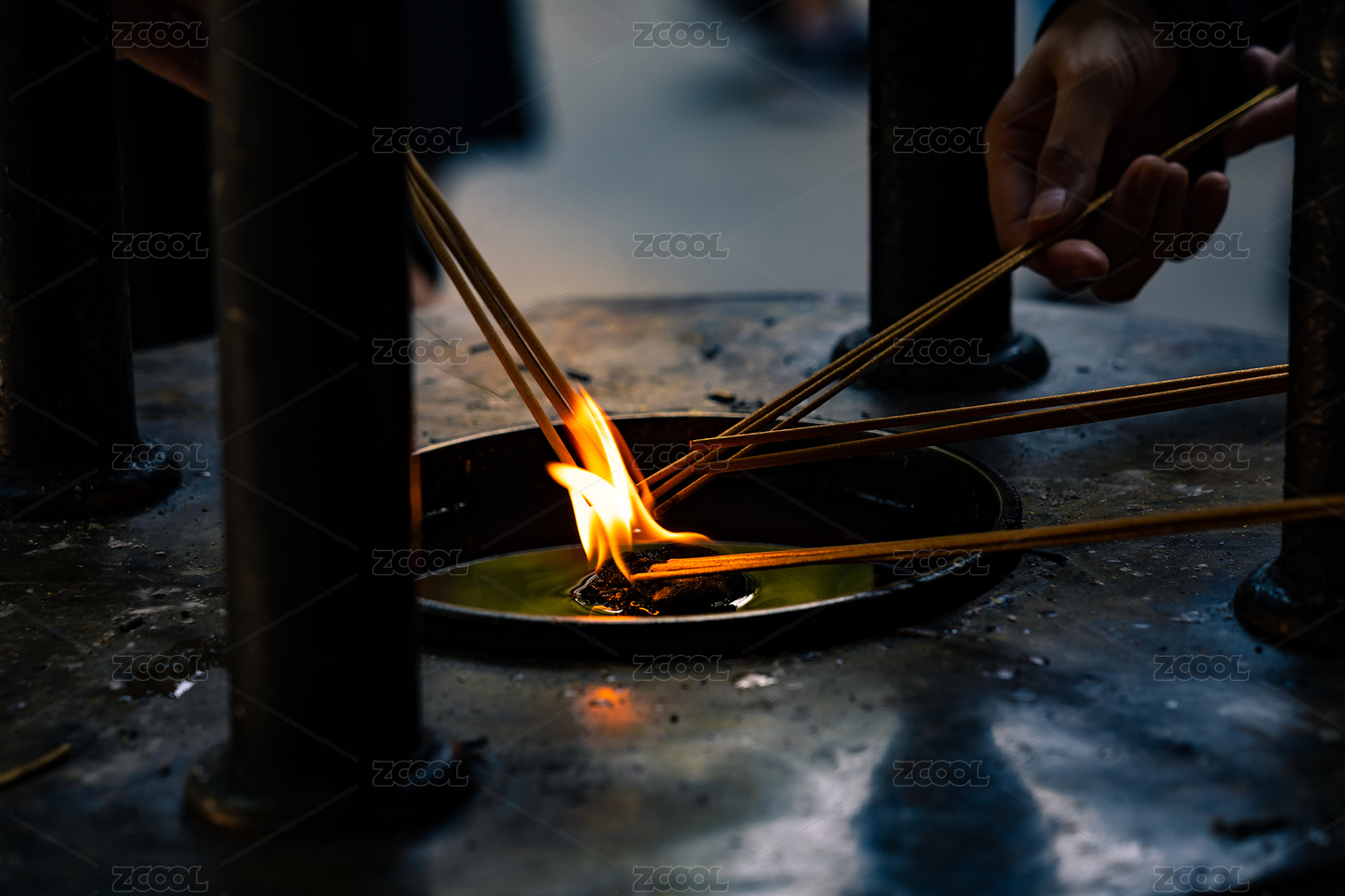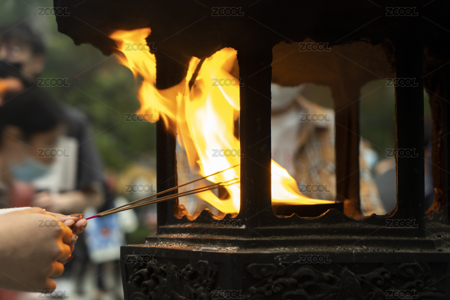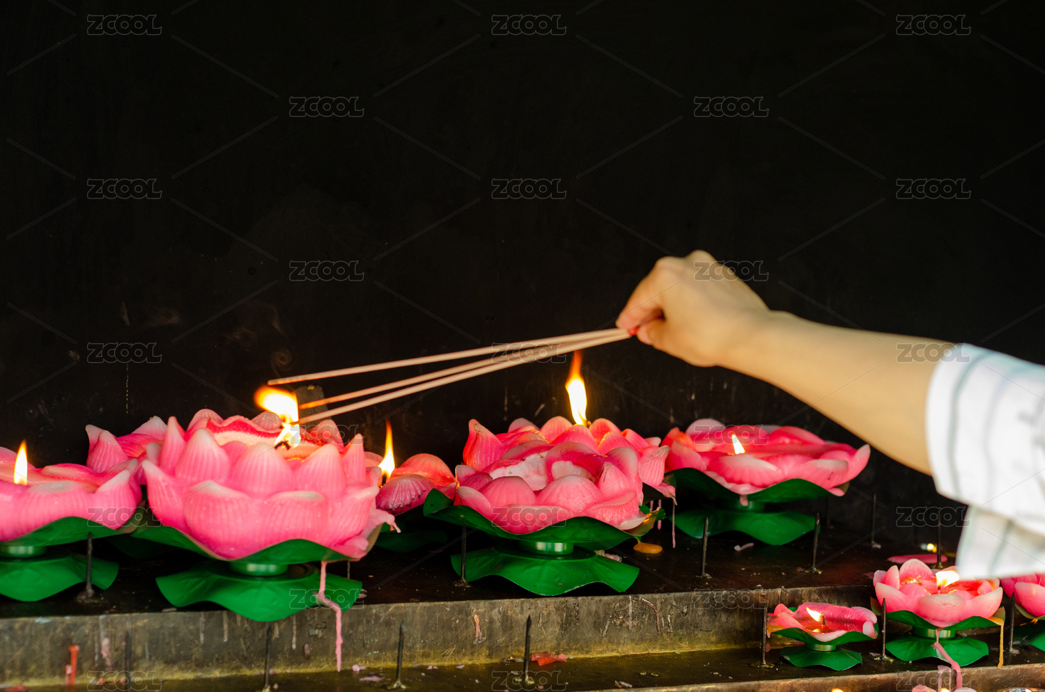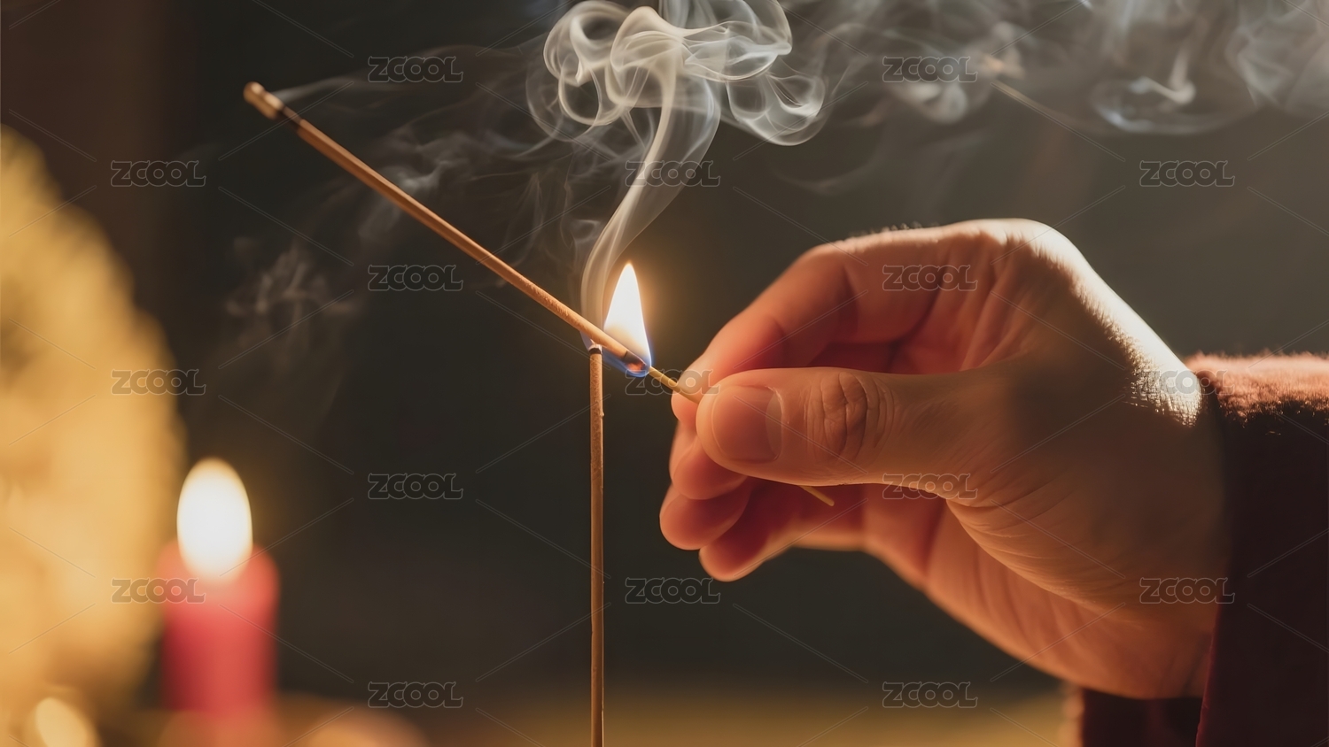 人们借燃烧的红色蜡烛点燃手中的一把香