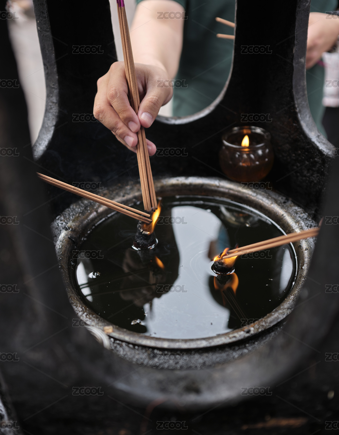 一双女生的手拿着香插到香炉里面烧香拜佛