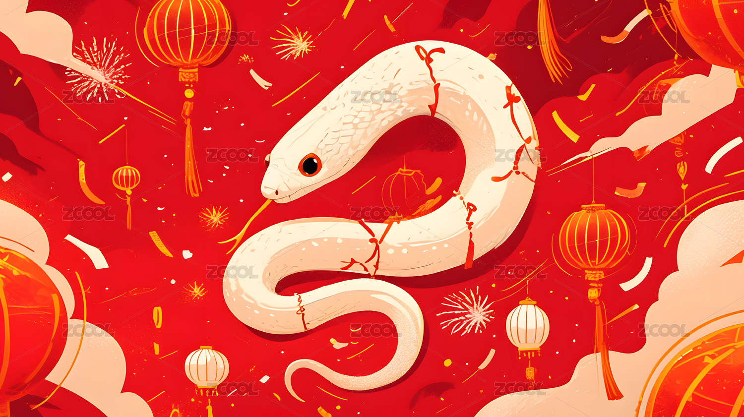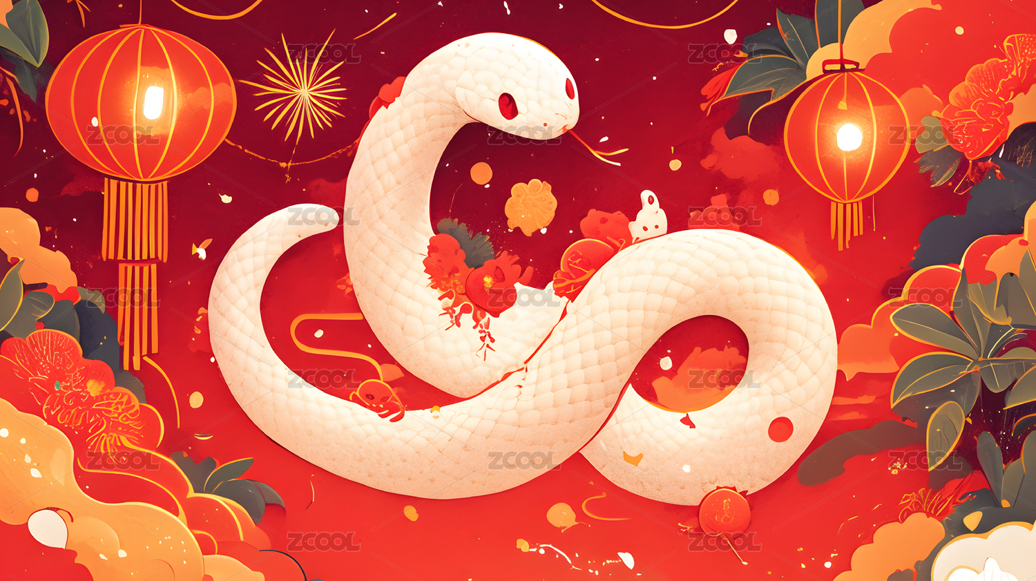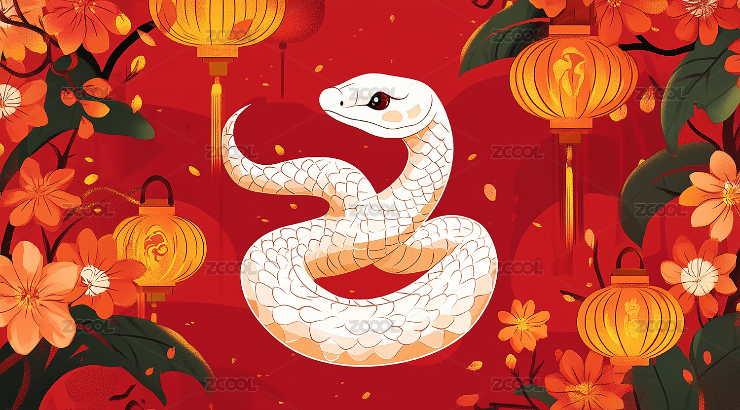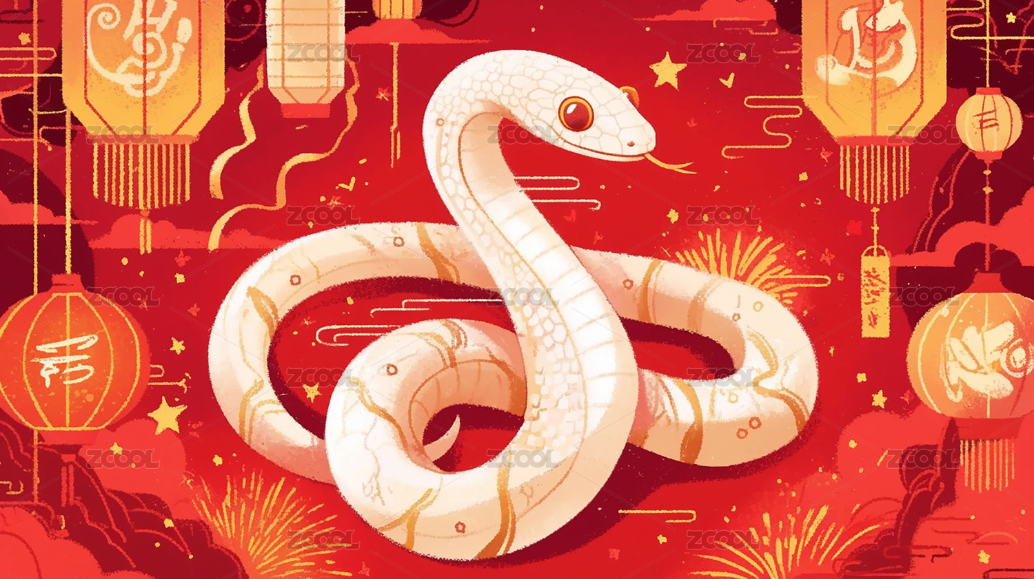 春节,蛇年,蛇,插画,新年,喜庆,生肖,灯笼,金色,红色
