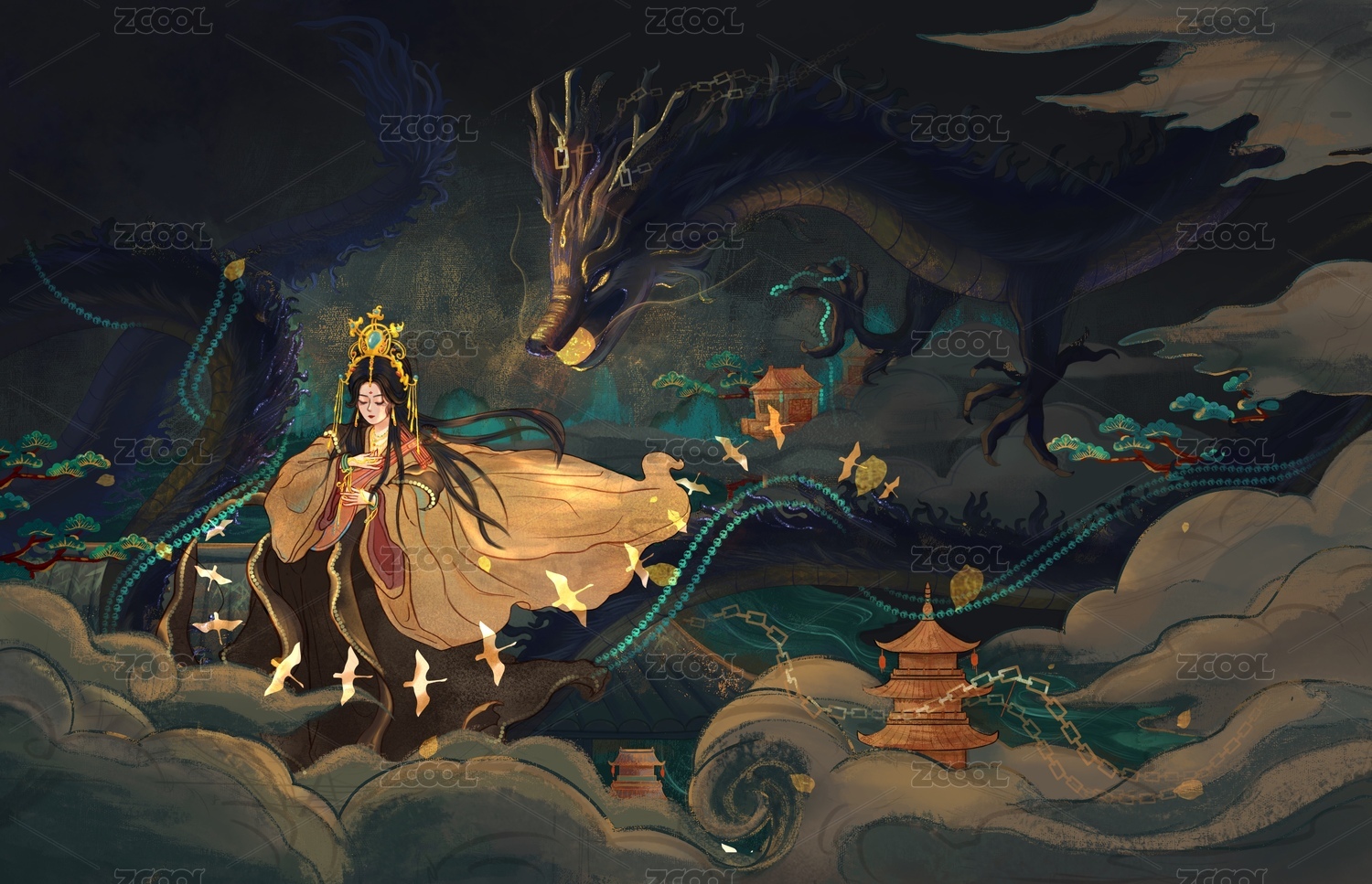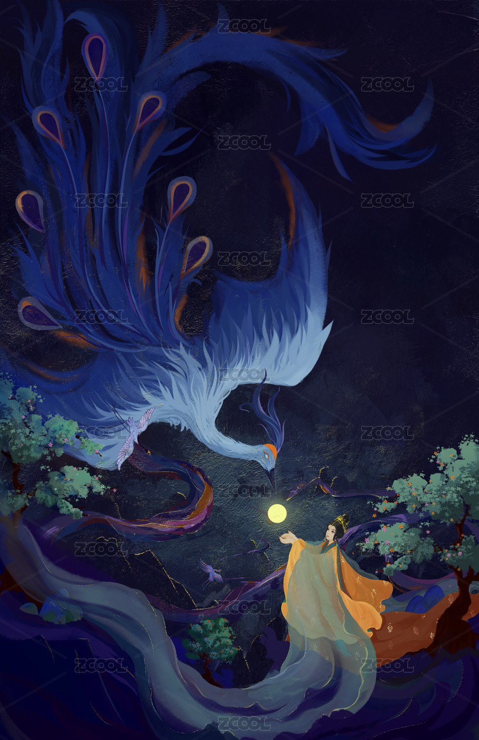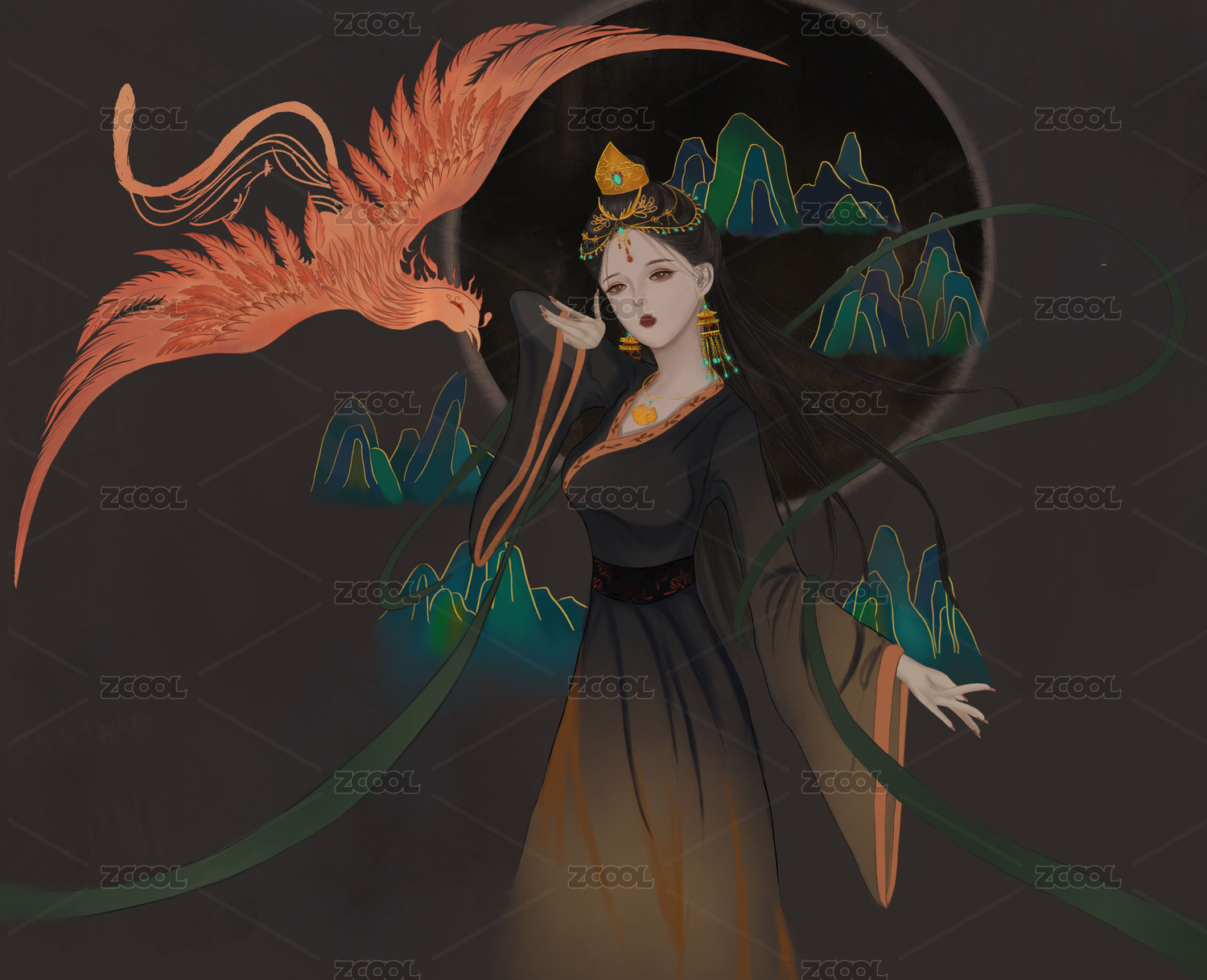 女孩,老虎,面具,宫殿,柱子,山海经,西王母,月亮,青鸟