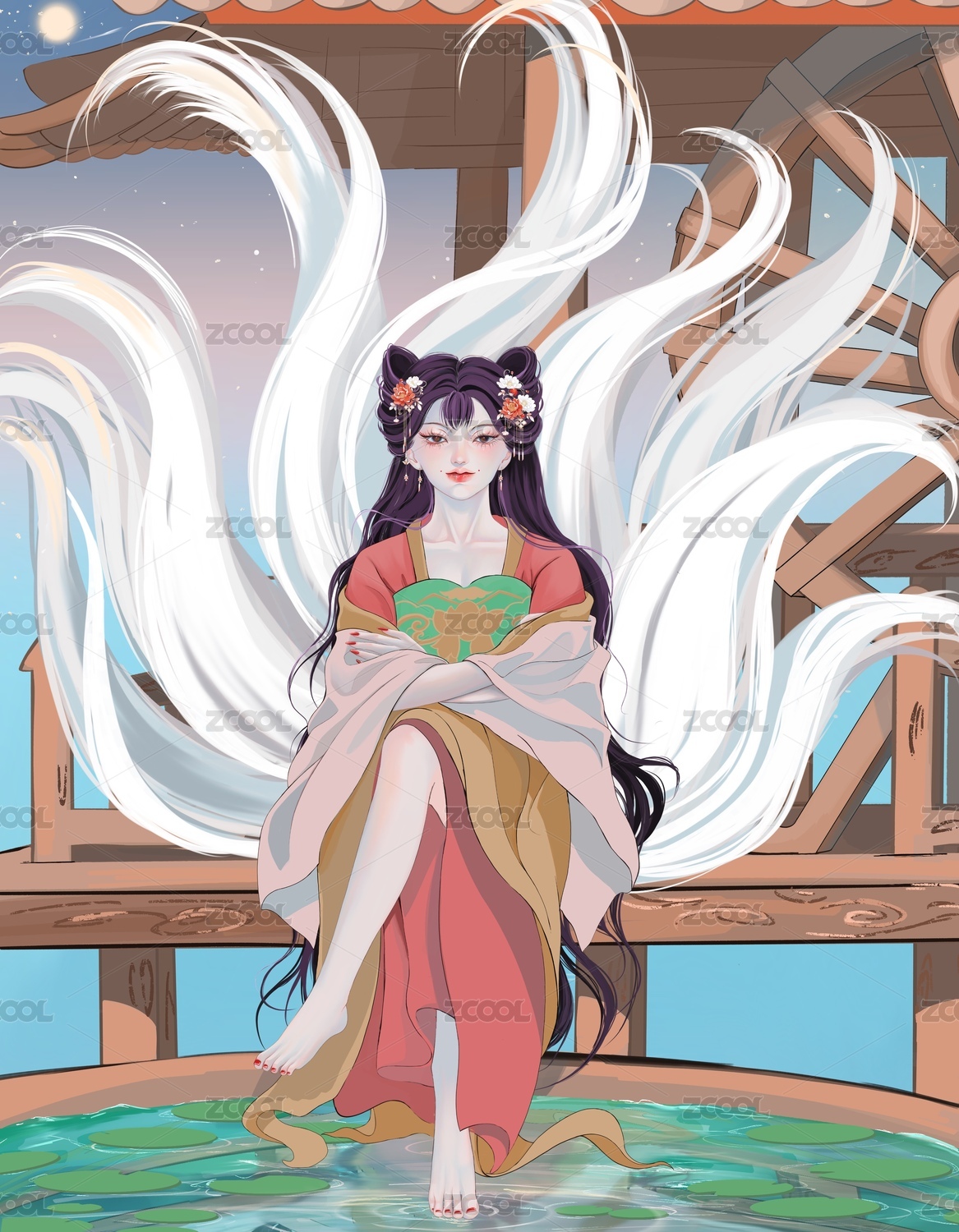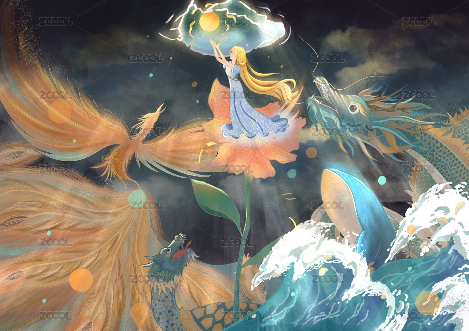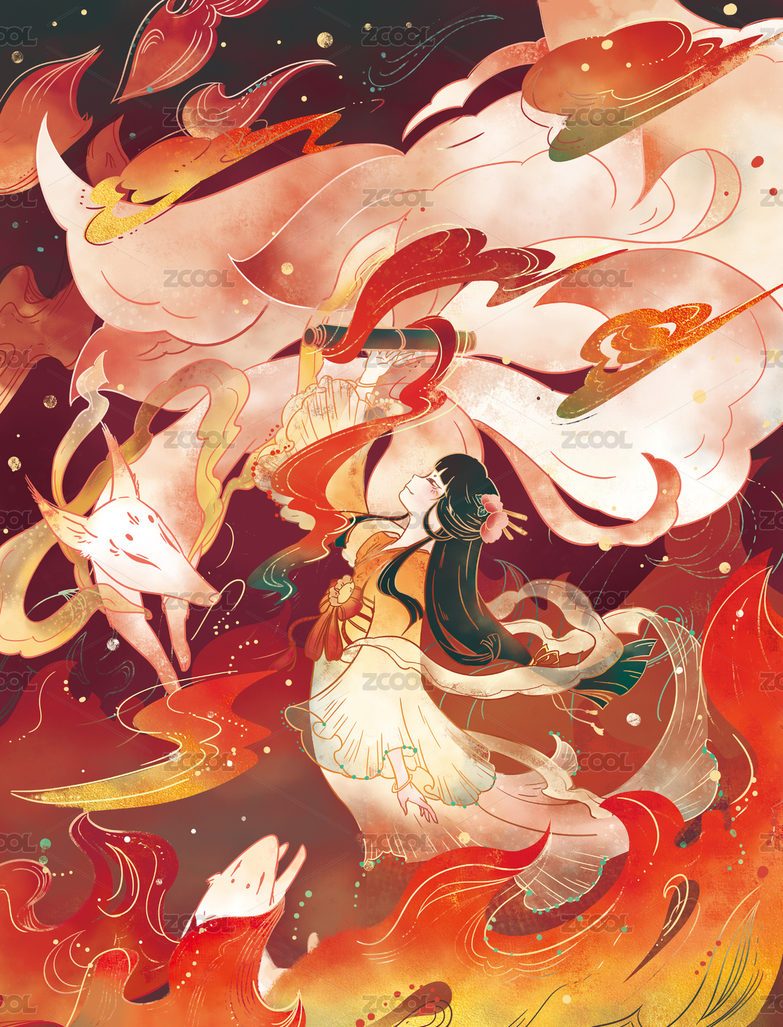 女孩,老虎,面具,宫殿,柱子,山海经,西王母,月亮,青鸟