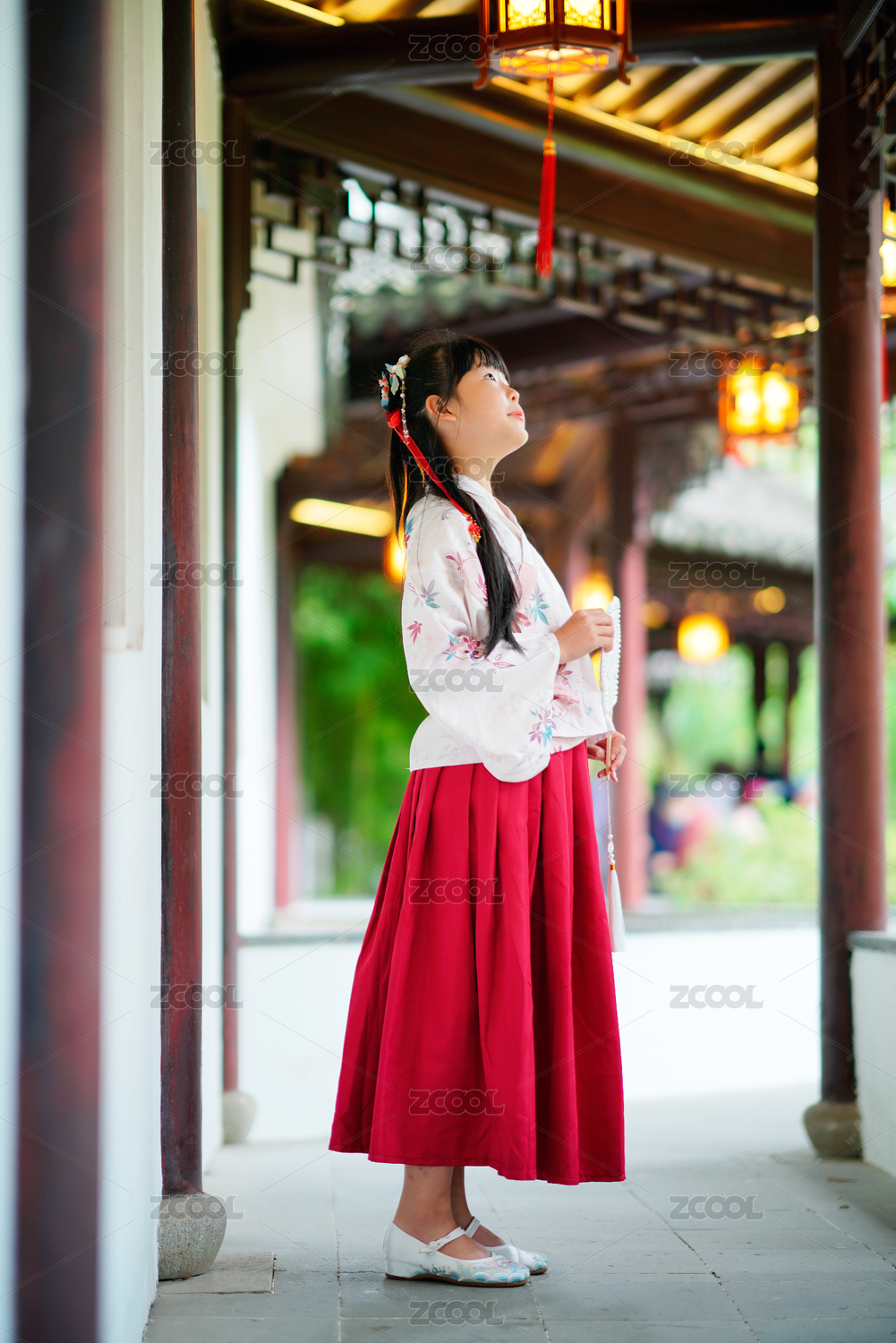 可爱亚洲美女穿着汉服手握扇子坐在连廊台上