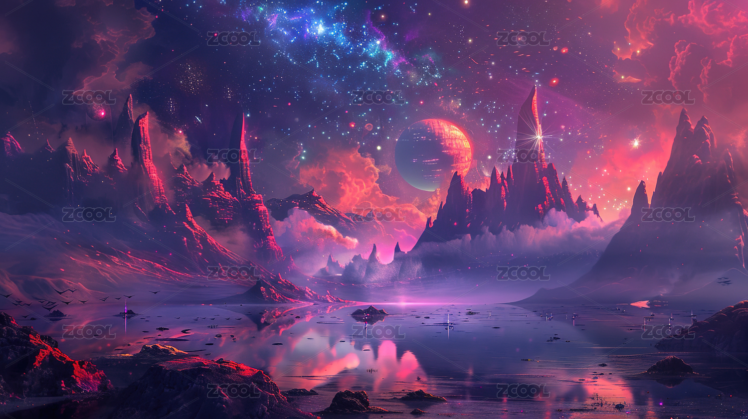 科幻,唯美,紫色,湖水,倒影,山脉,星光,星云,景观,太空