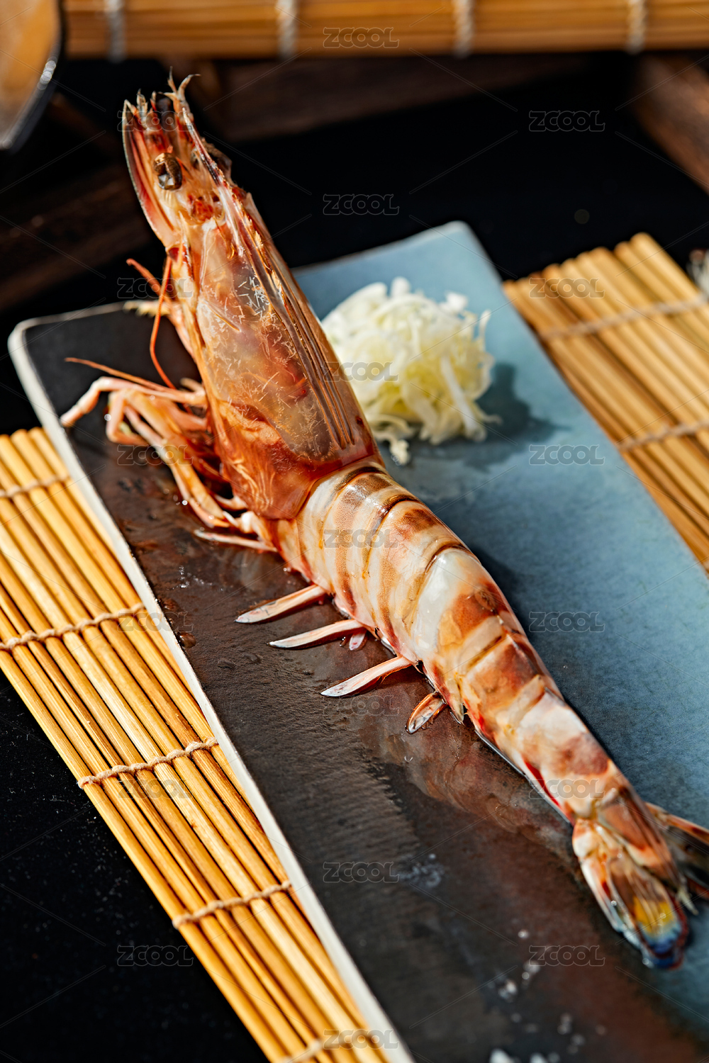 长方形瓷盘装的铁板野生明虾皇摆放在草垫上