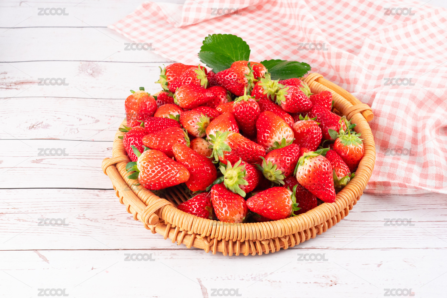 白色桌面上放着一堆散落的带着绿叶的草莓