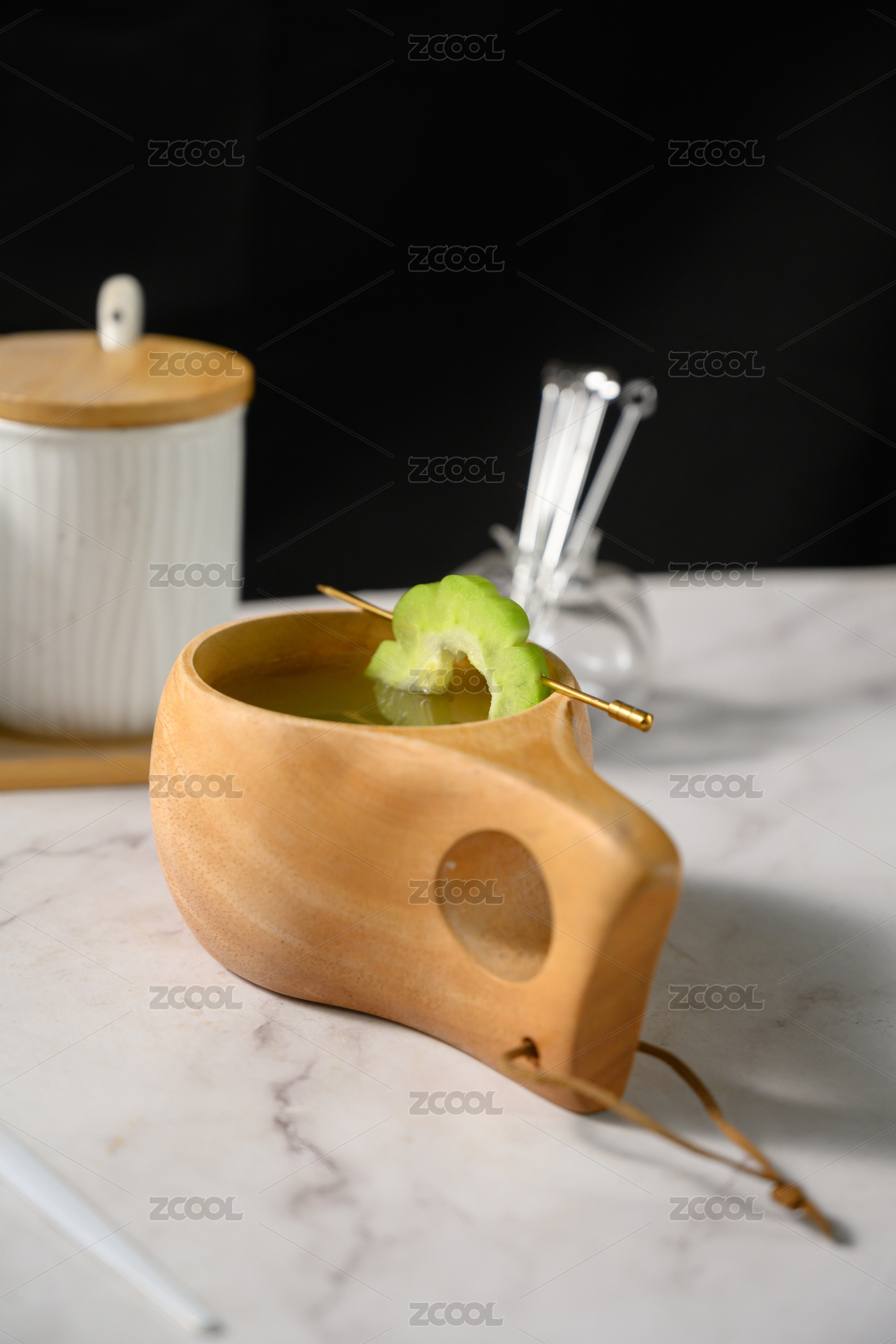 桌面上的杯子里的美味可口的苦瓜汁