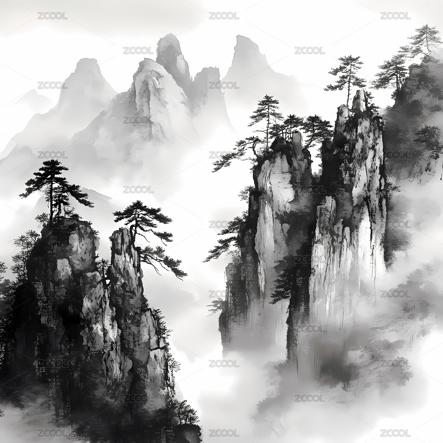 中国画,水墨画,山水,风景,群山,树,云雾,瀑布,绘画,艺术