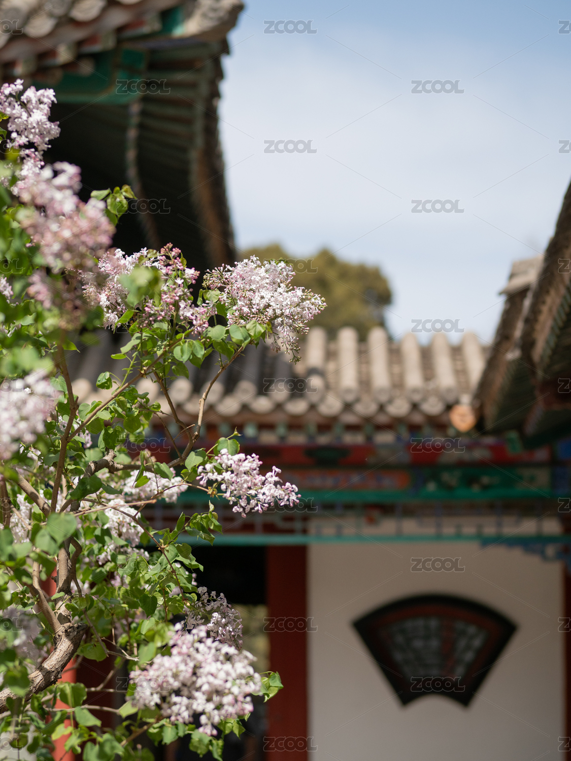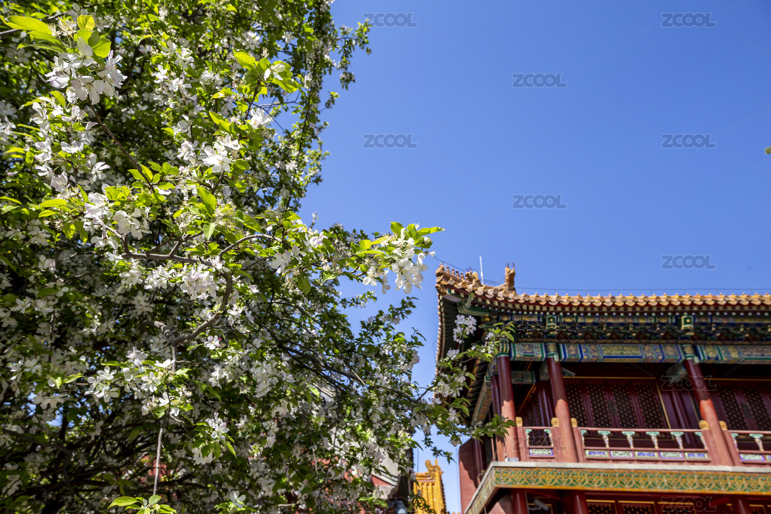 蓝天下北京八大处春花掩映的寺庙屋檐
