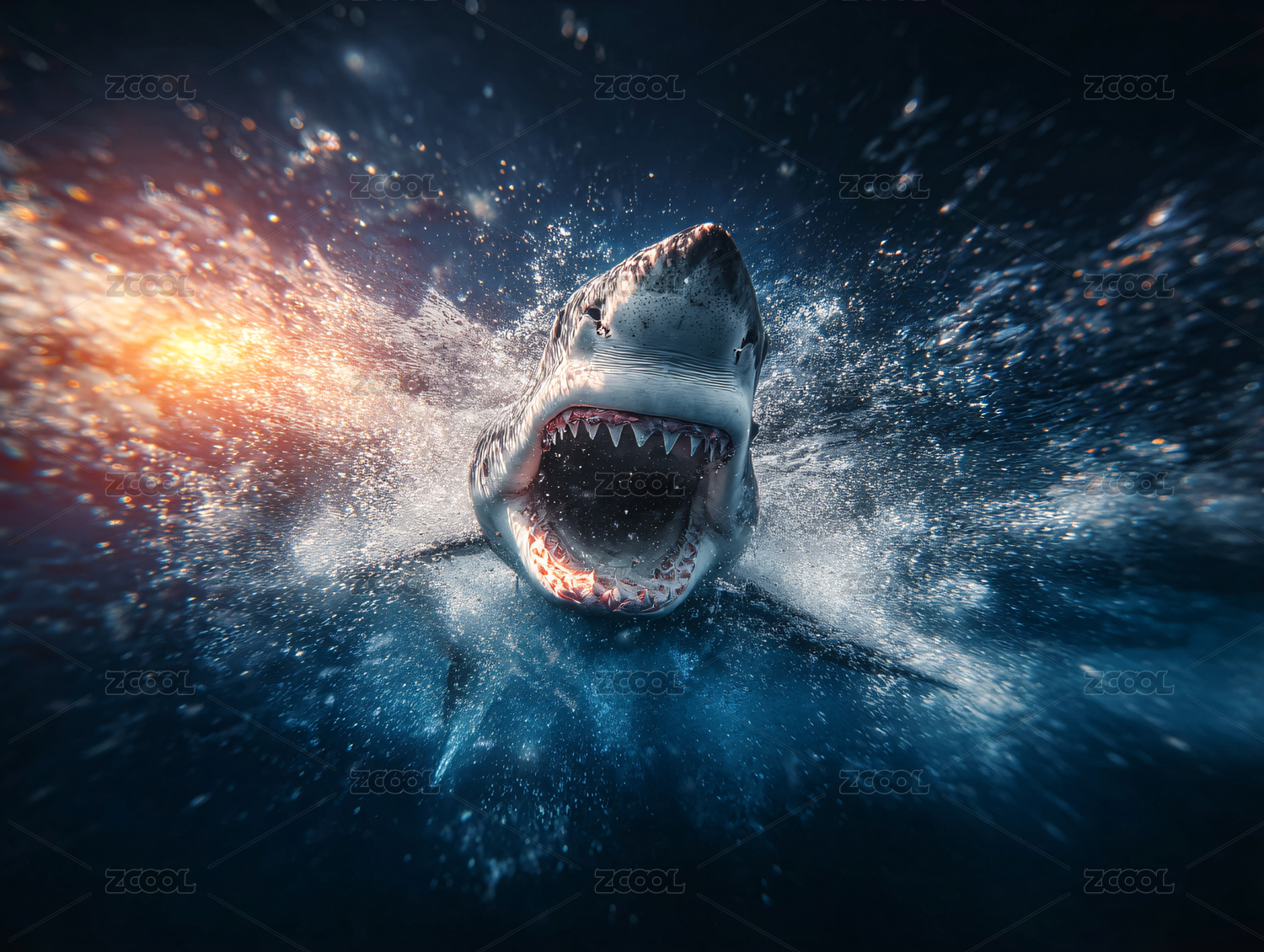 大白鲨破浪而出,张开巨口