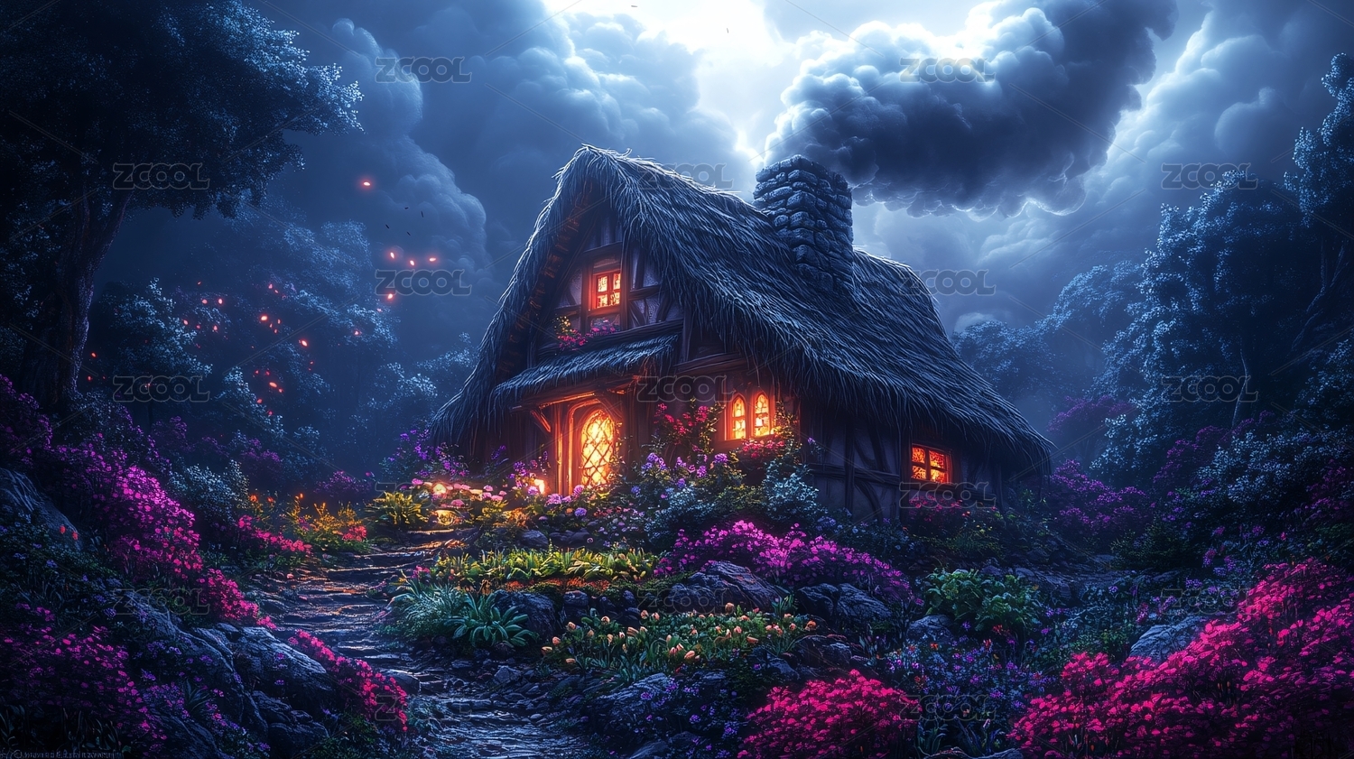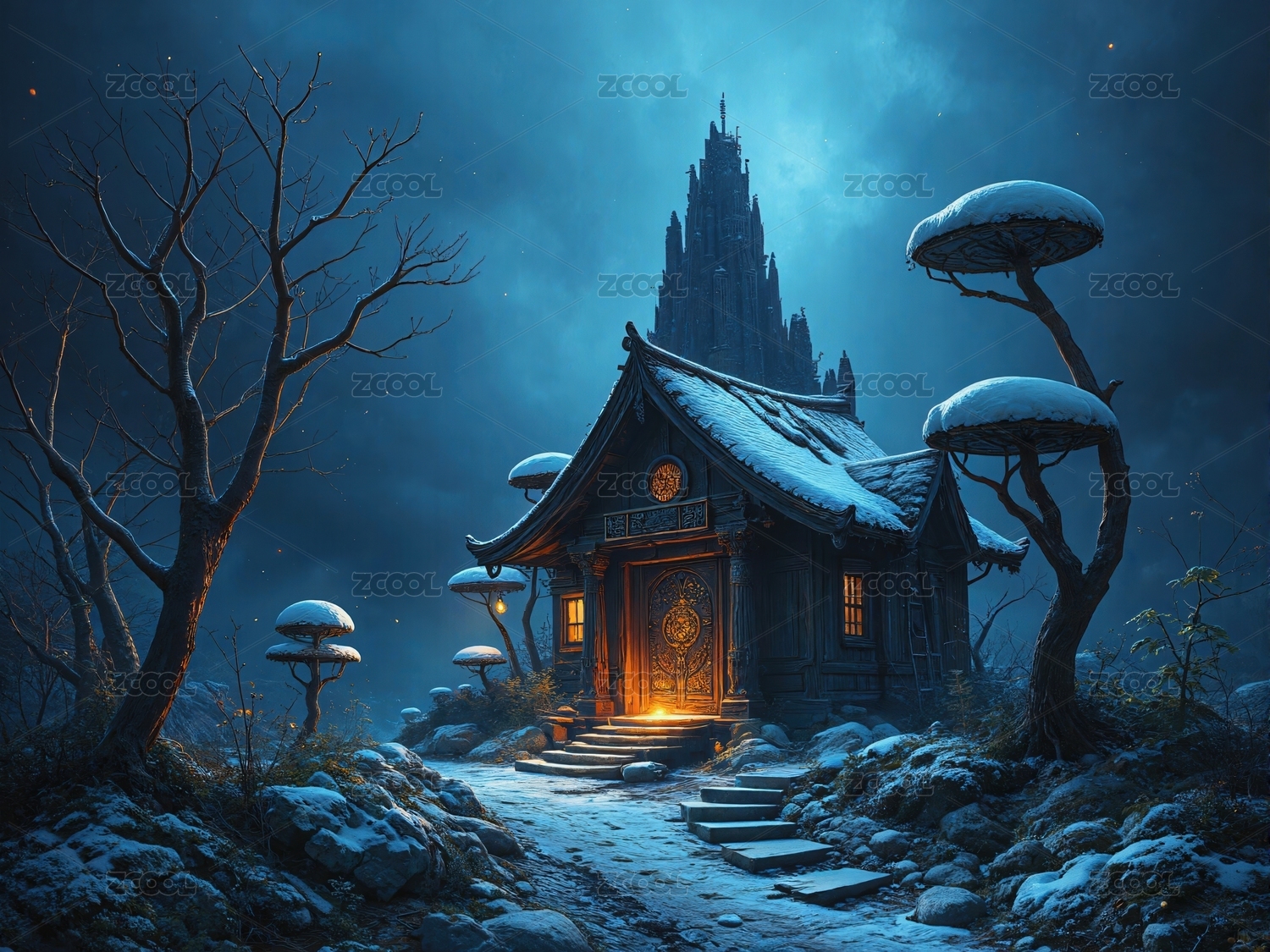 梦幻森林小屋夜景