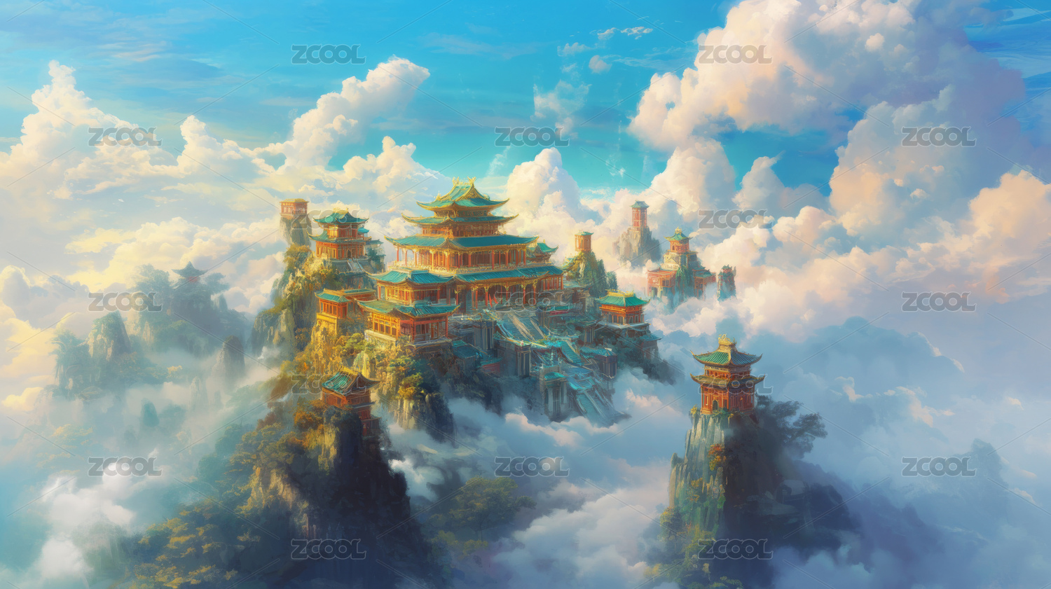 云端,森林,树木,雾气,飘渺,蓝色,白色,光线,阳光,云层
