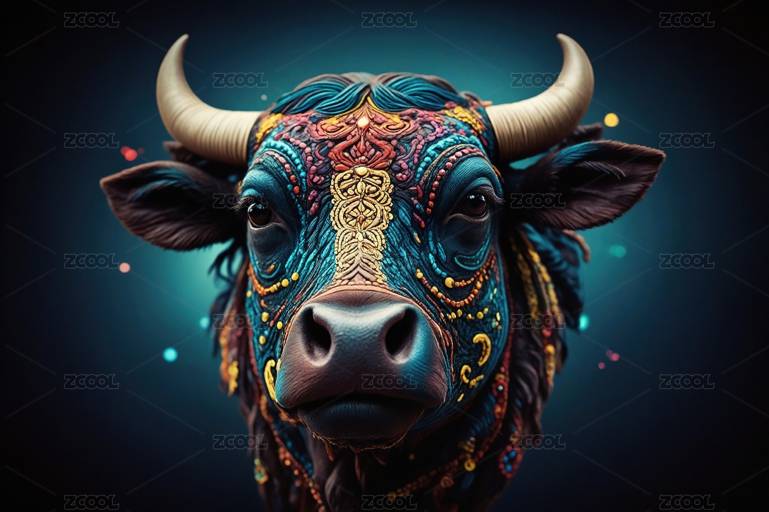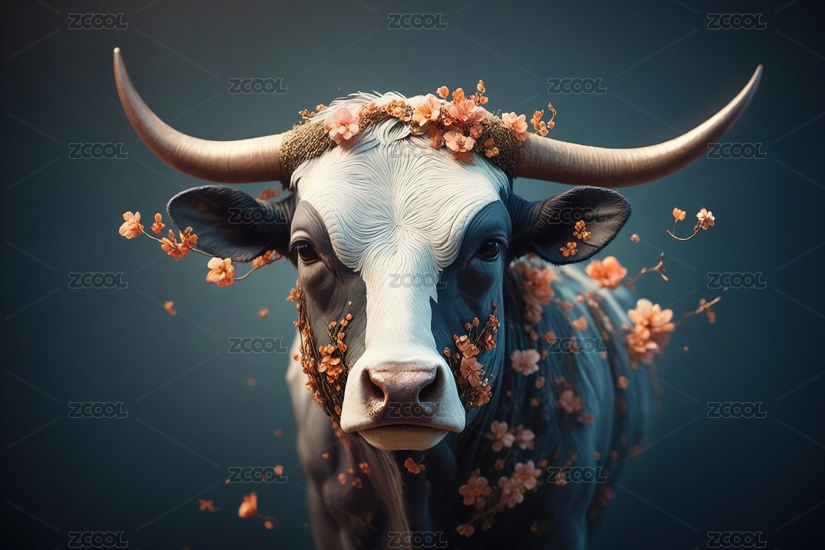 牛,花环,角,眼睛,毛发,背景,色彩,光影,对比,神态