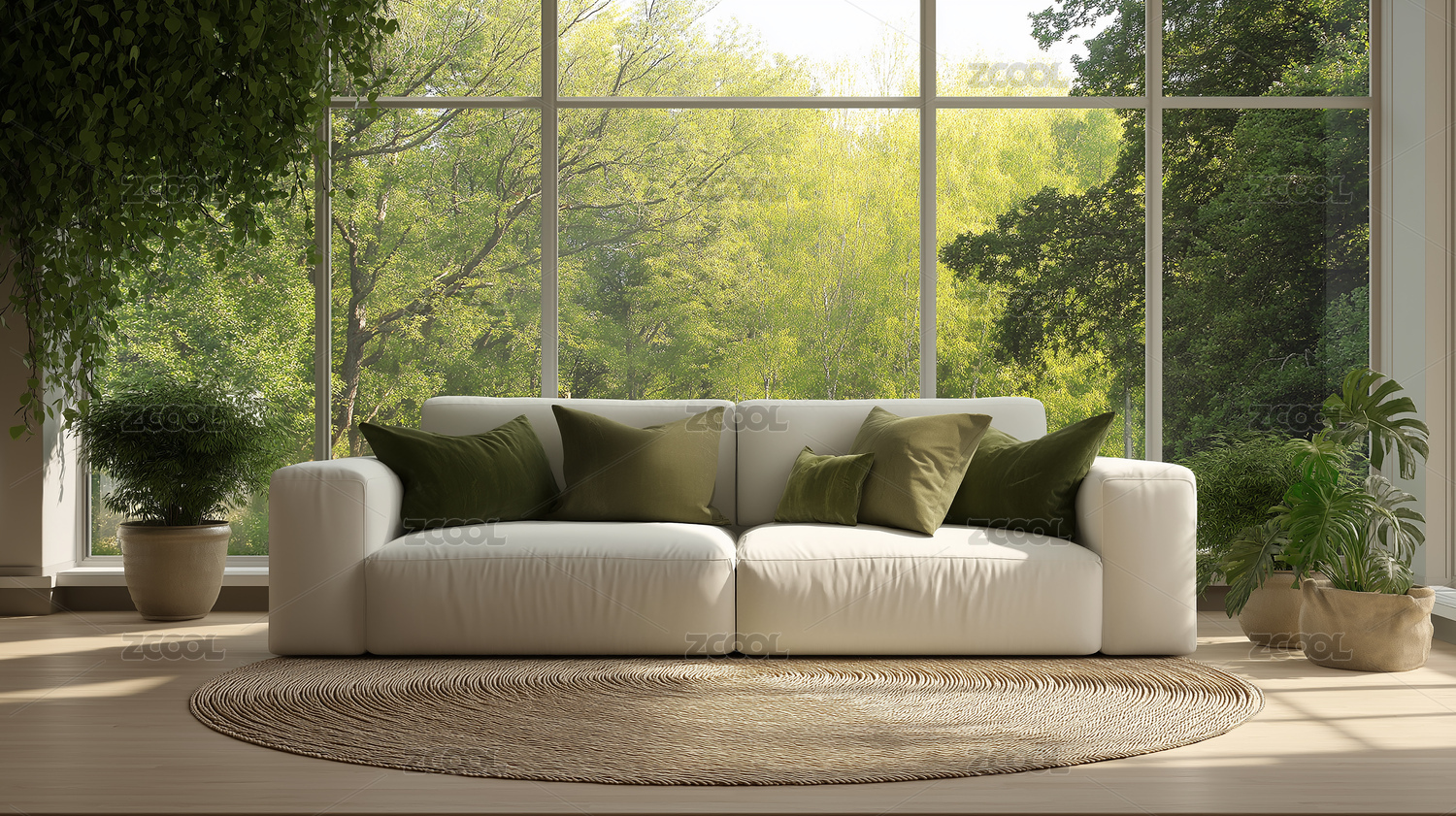 大窗绿植旁白色沙发配绿抱枕的客厅