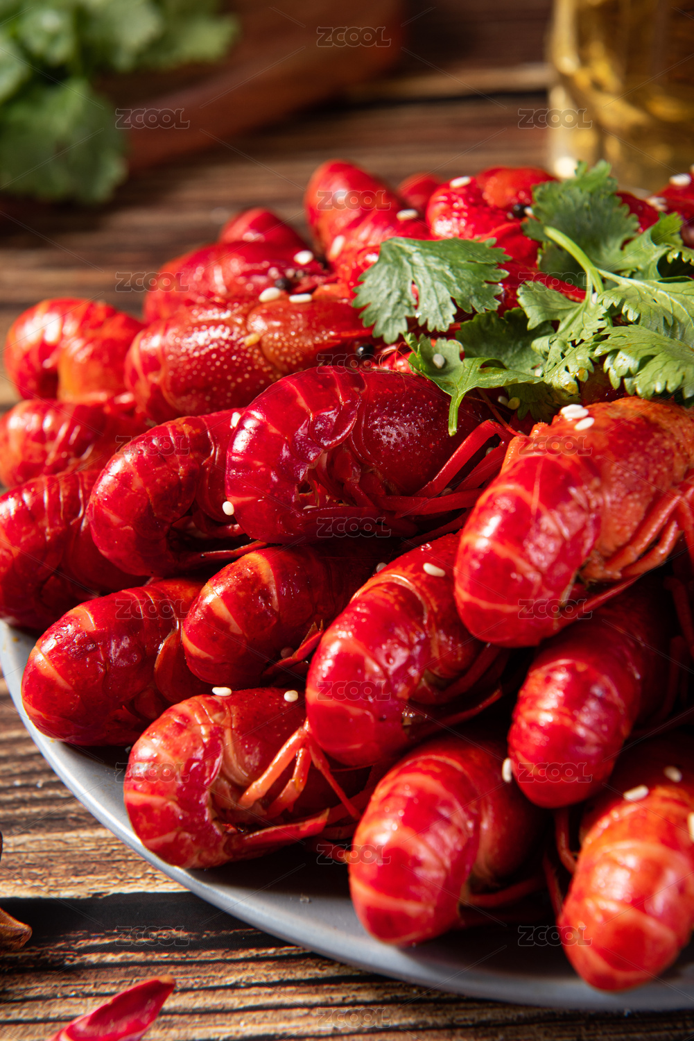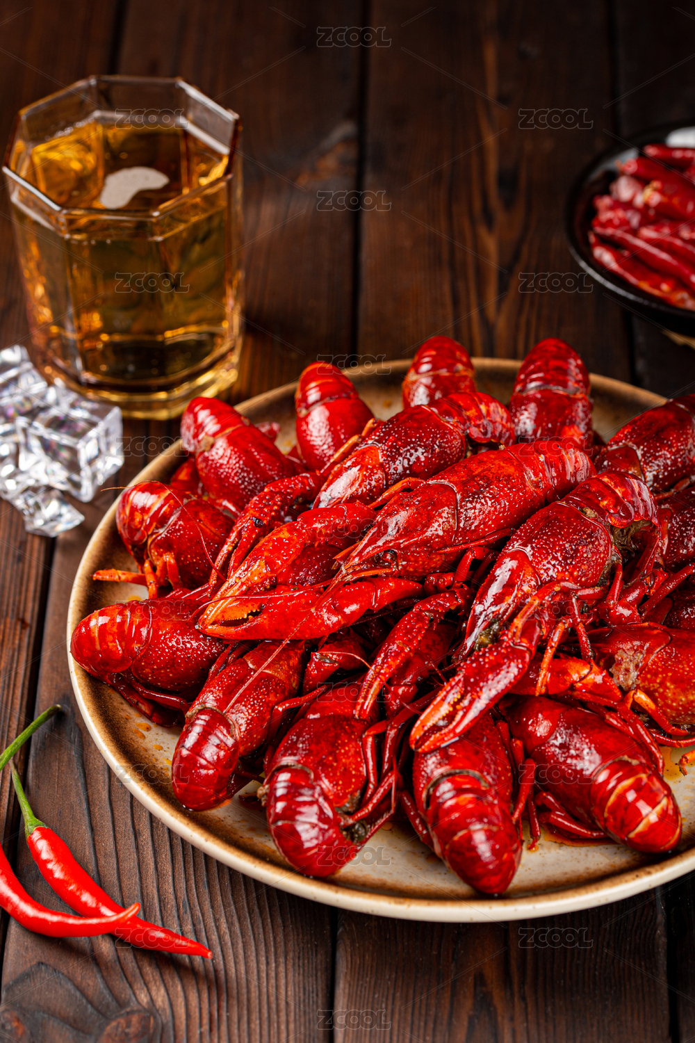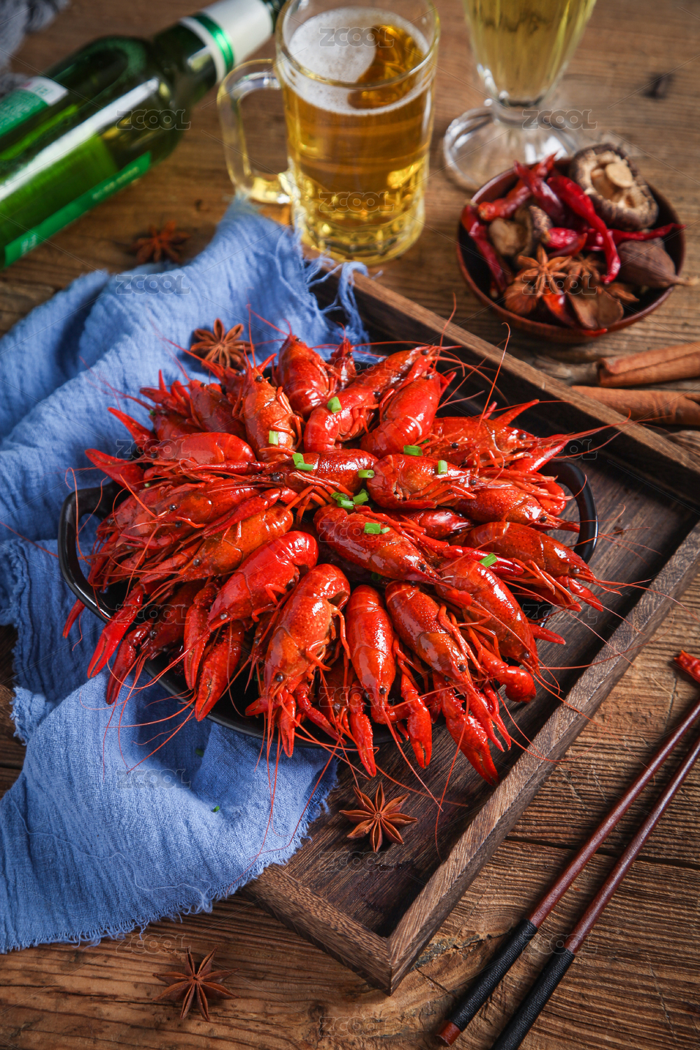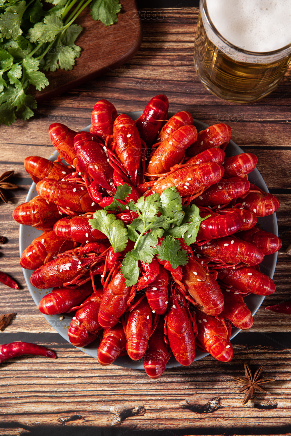 木纹底上的红烧啤酒麻辣小龙虾