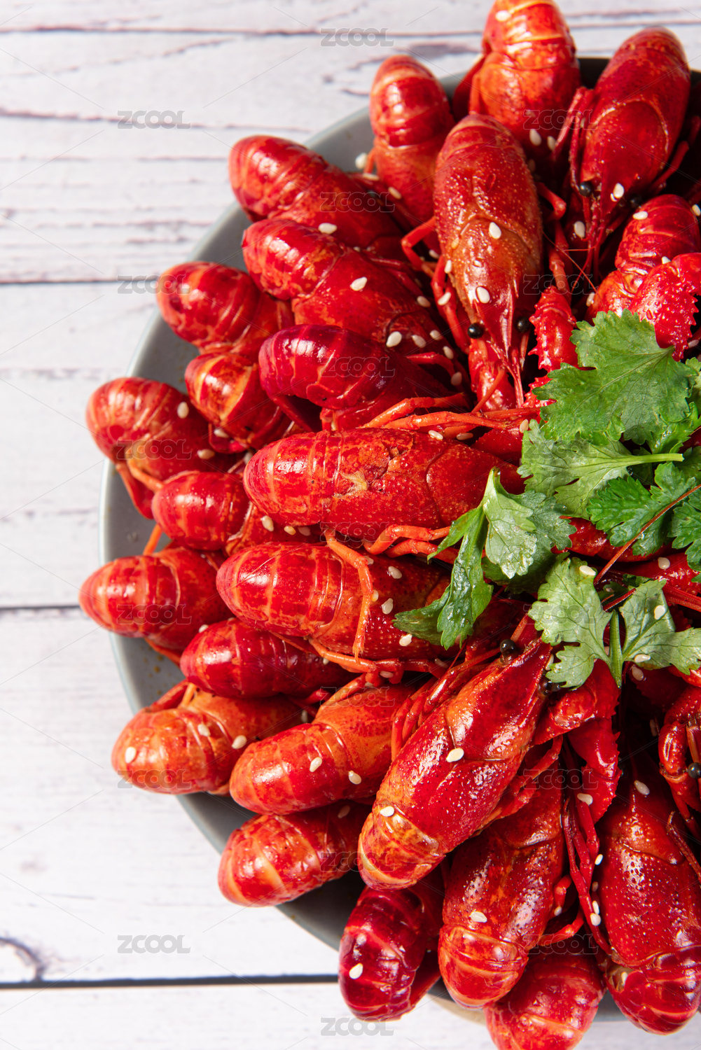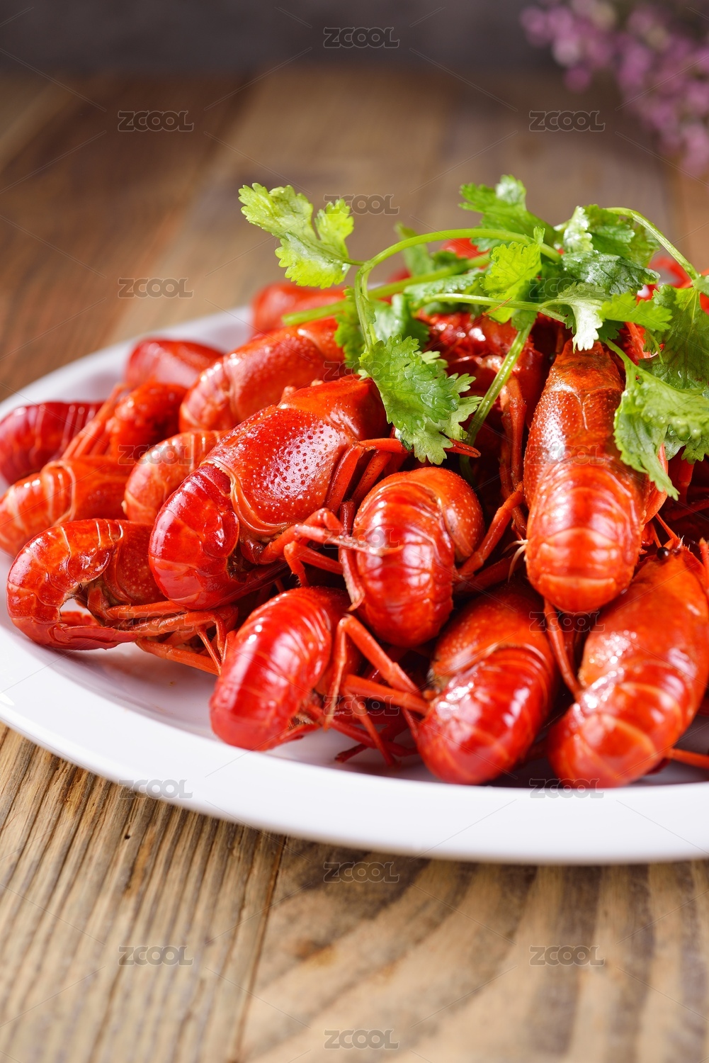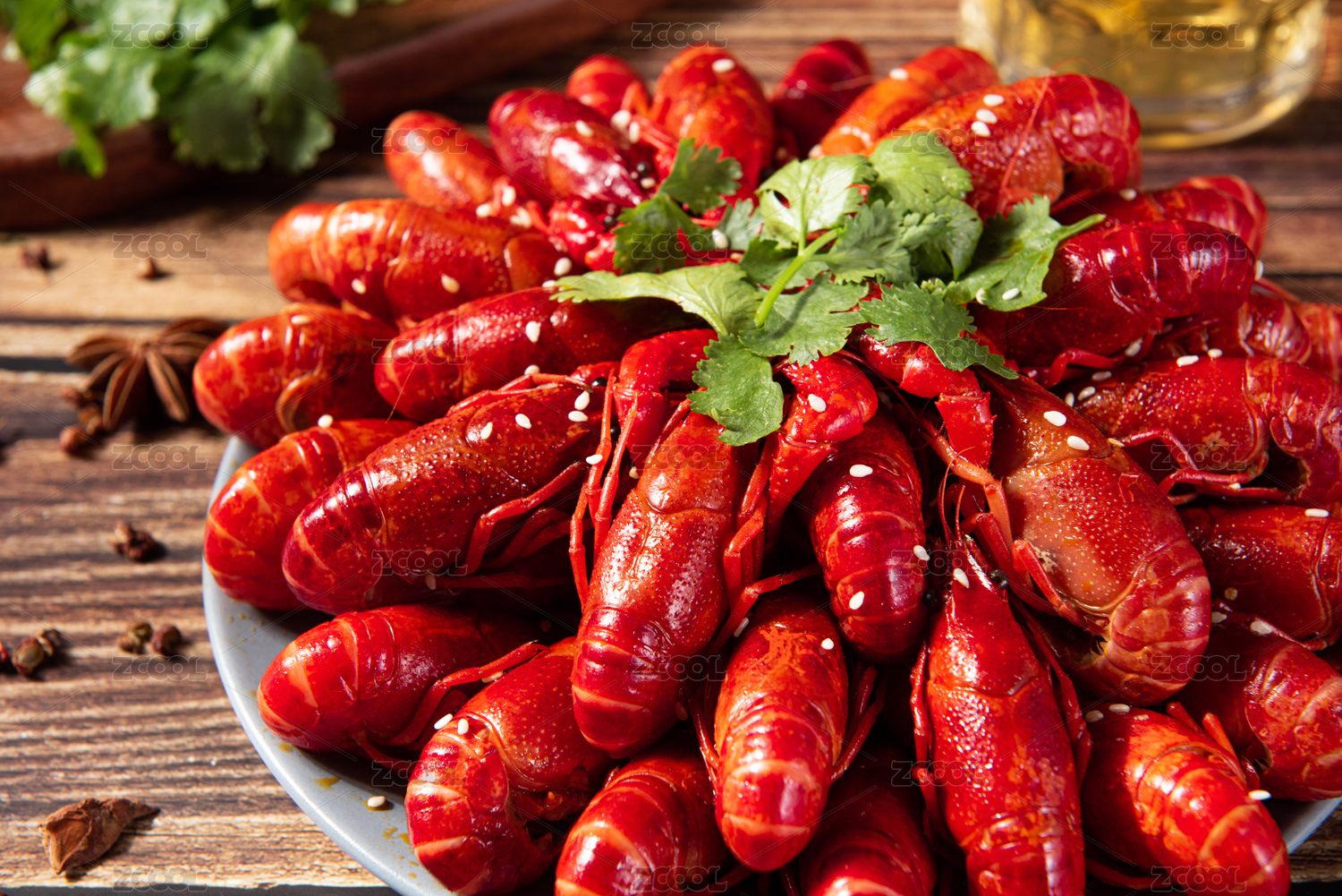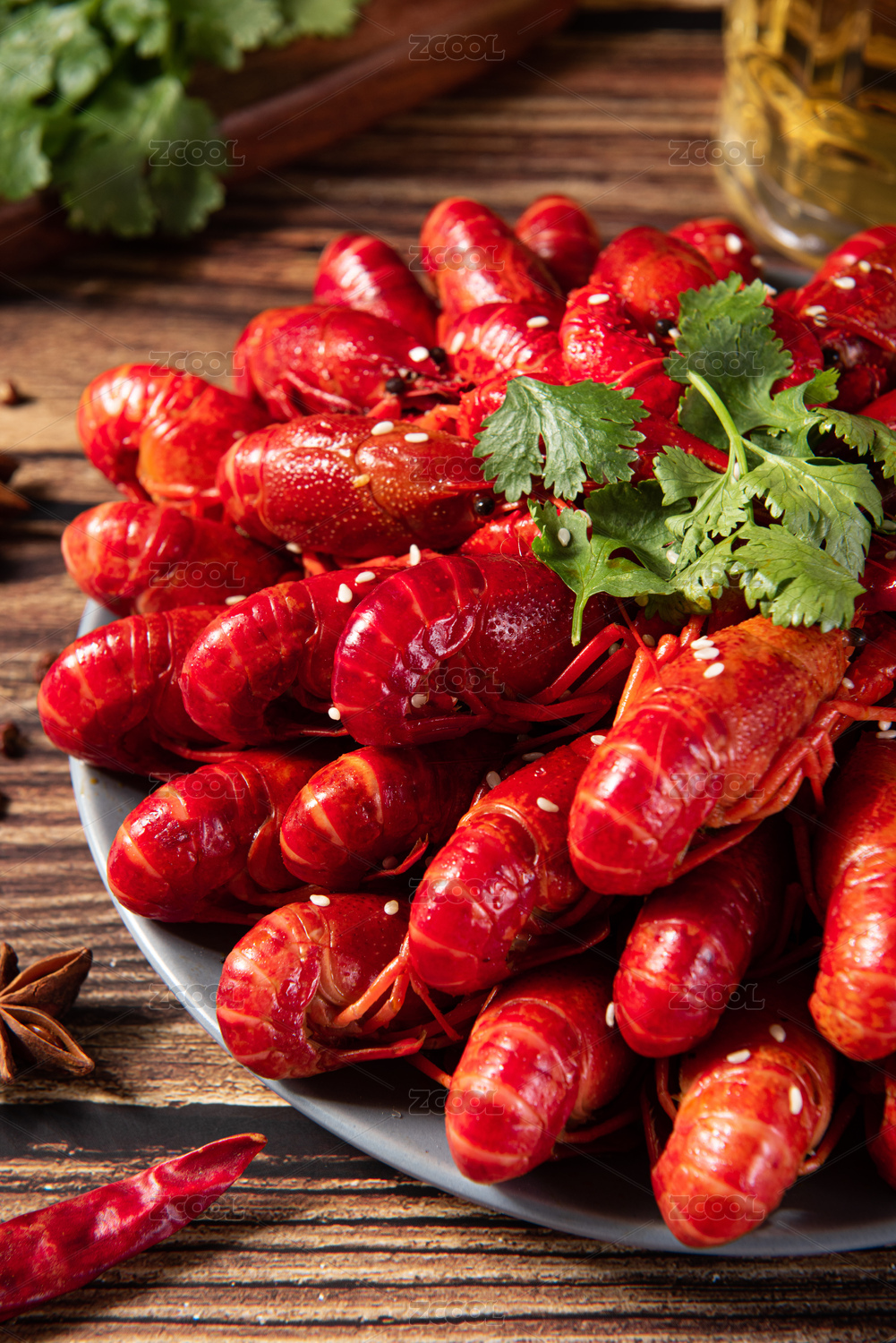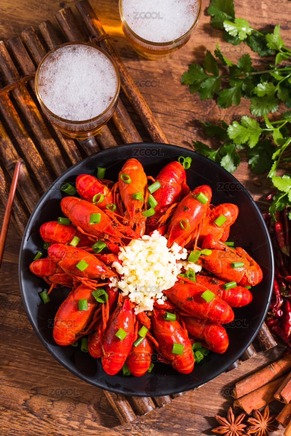 木纹底上的红烧啤酒麻辣小龙虾