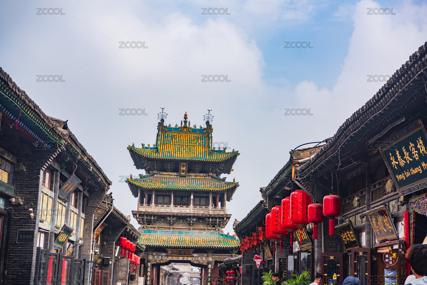 中国山西平遥县平遥古城清晨没有游客的市楼街道