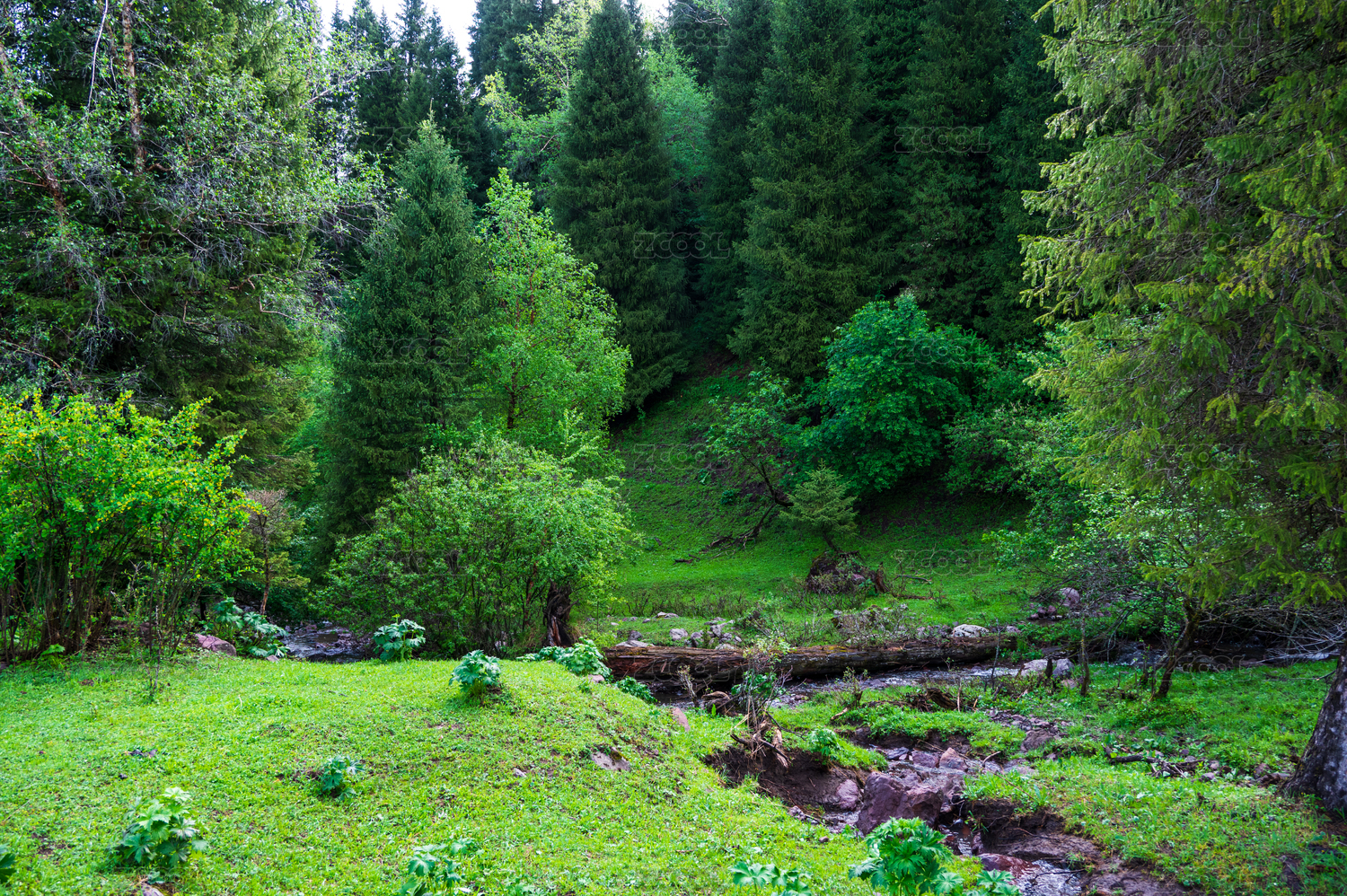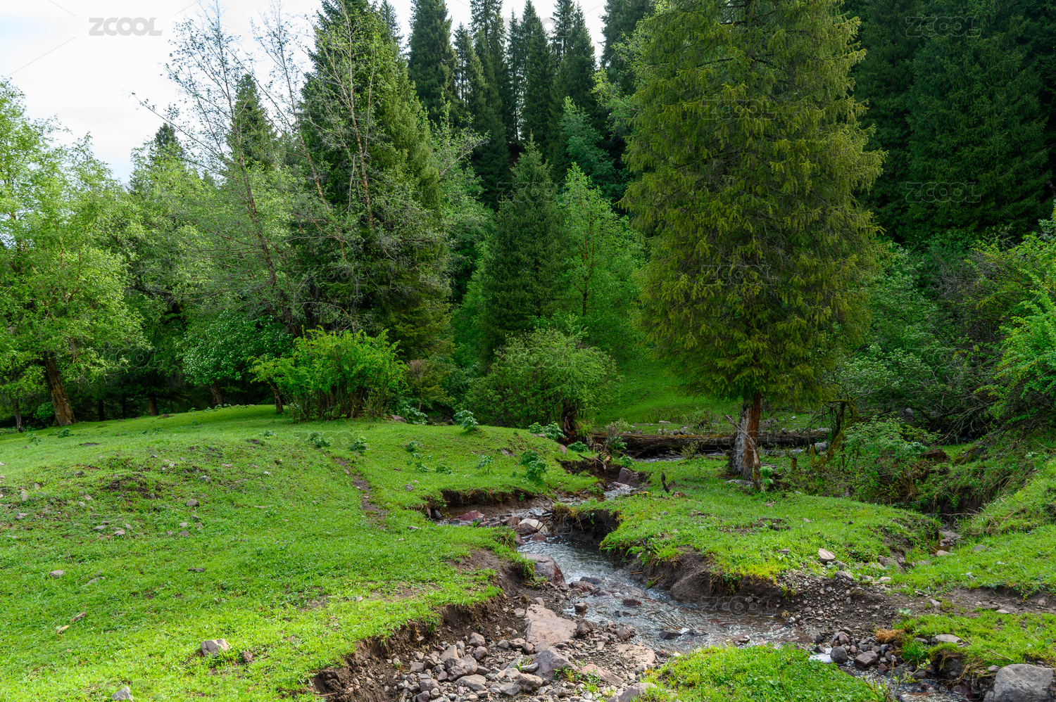 中国新疆伊犁那拉提草原盘龙谷道森林流水