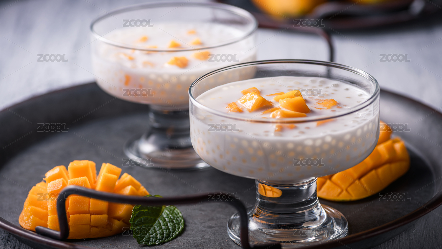 灰色背景布的木碟上摆放着一杯芒果西米露