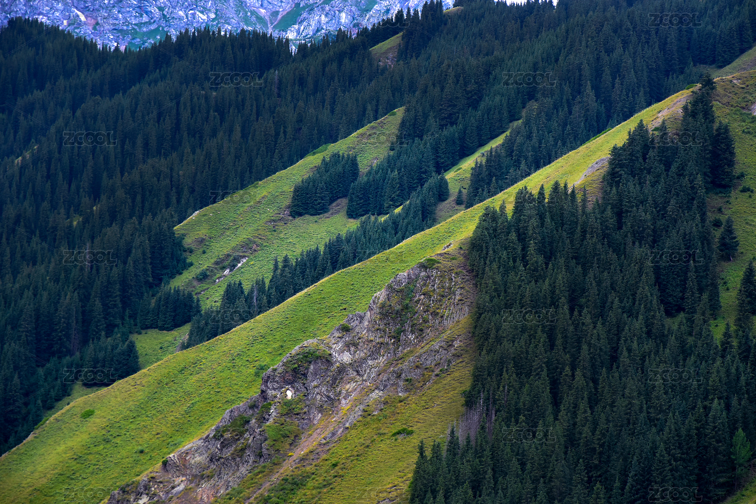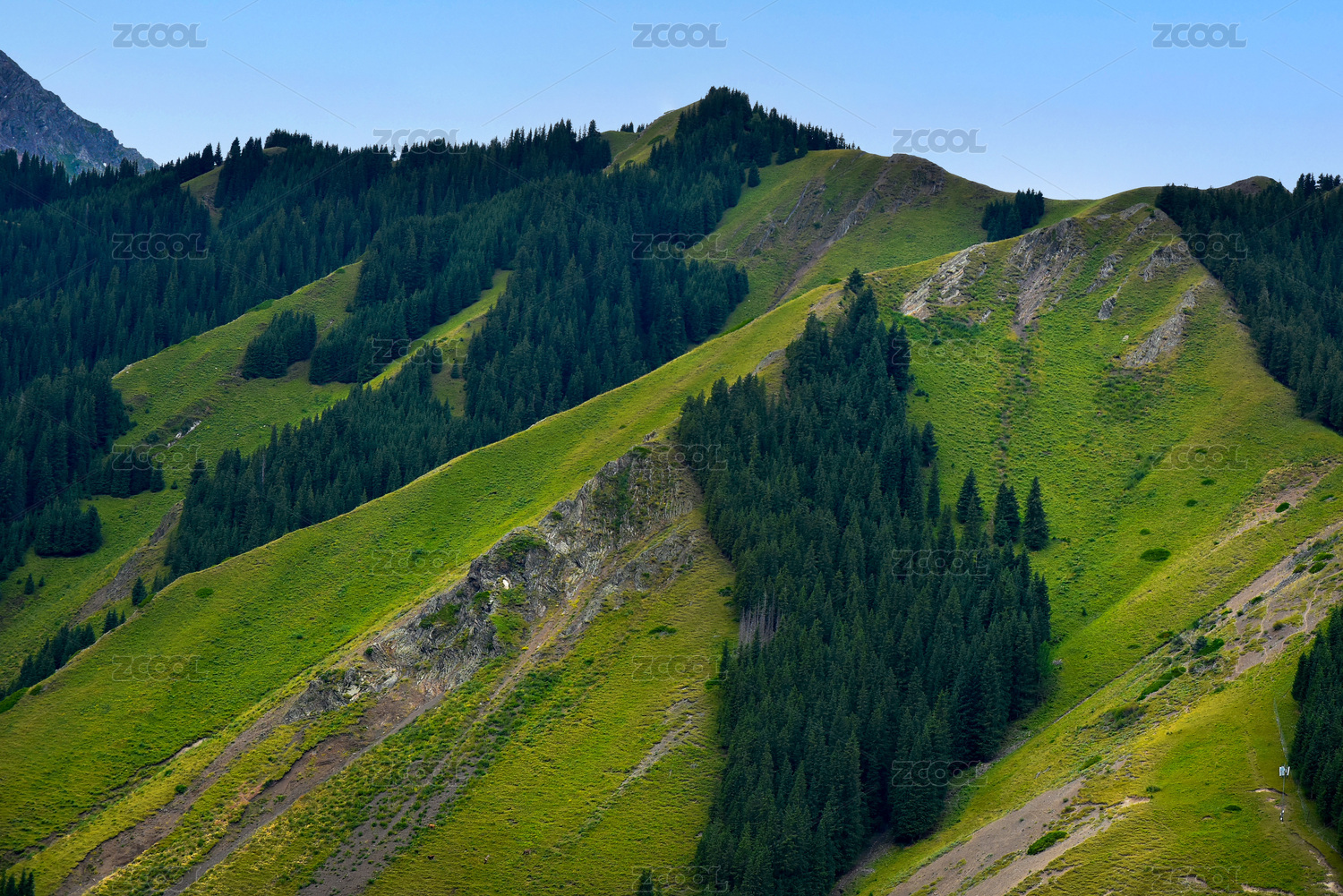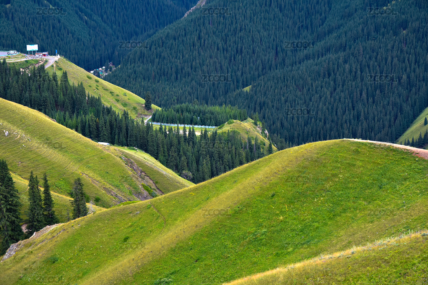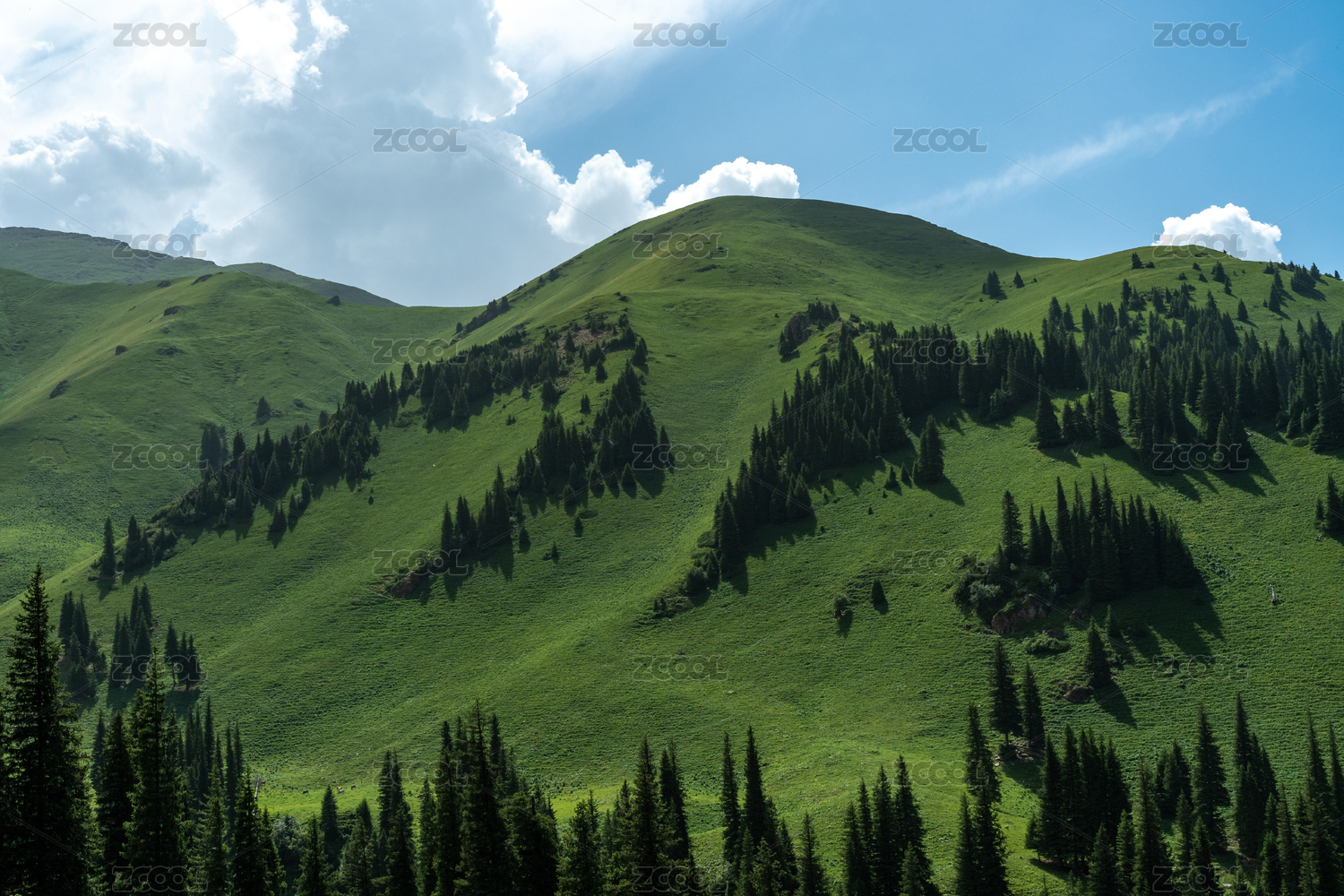 中国新疆伊犁果子沟山间森林与绿色山坡景观