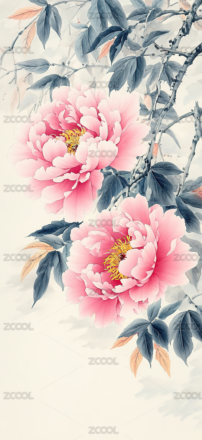 国潮牡丹花,中国风工笔画牡丹花卉插画