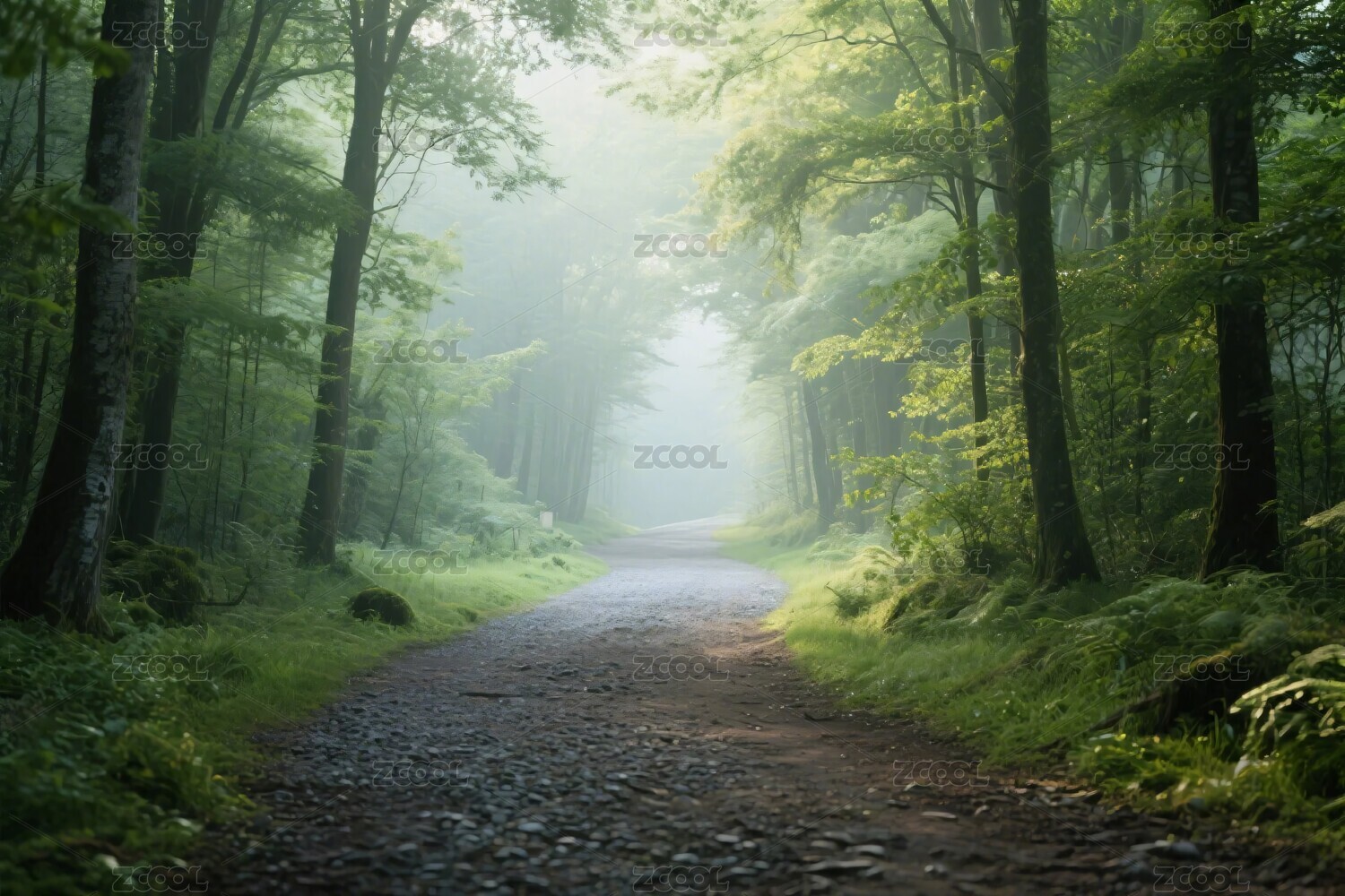 阳光穿过茂密树丛投射在树林中的一条小路上