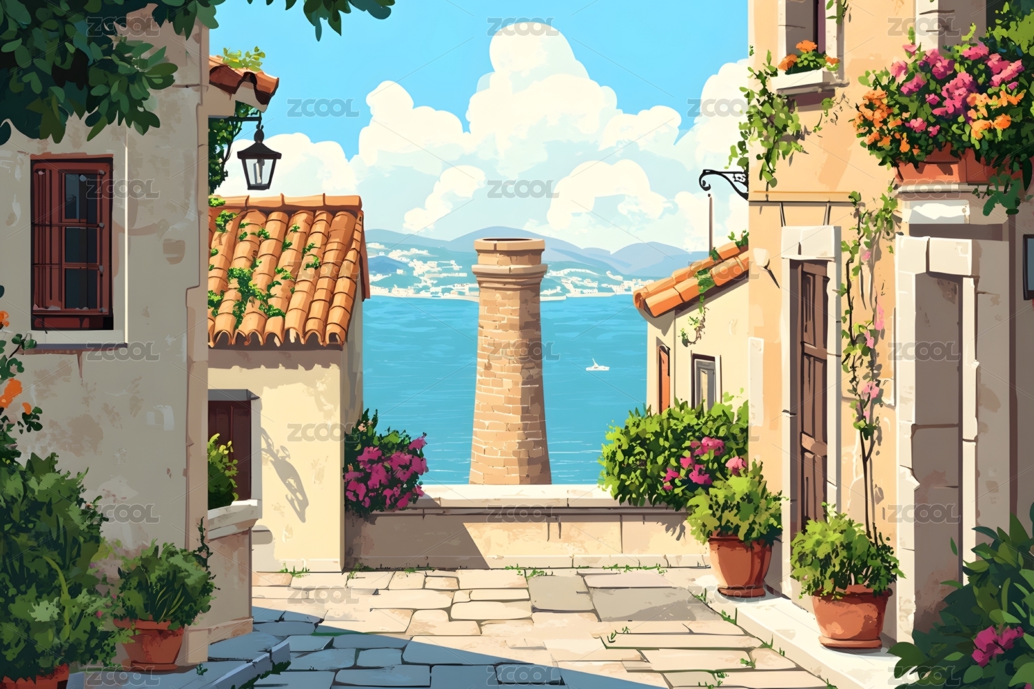 海边花盆建筑风景插画海报背景